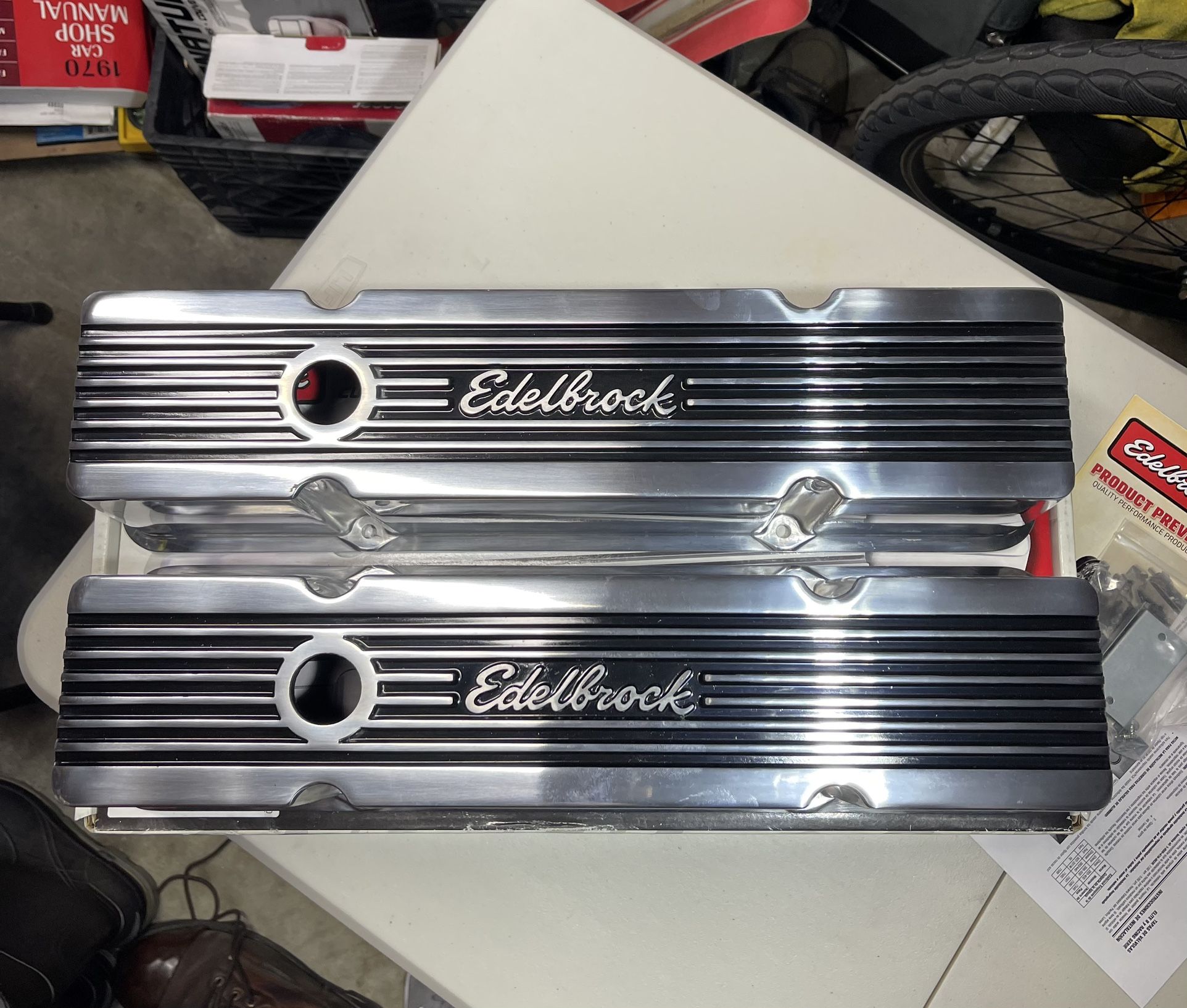 Edelbrock 4263 valve covers for Chevrolet v8 262ci-400ci, Including 350ci. Finned aluminum with black inlay.