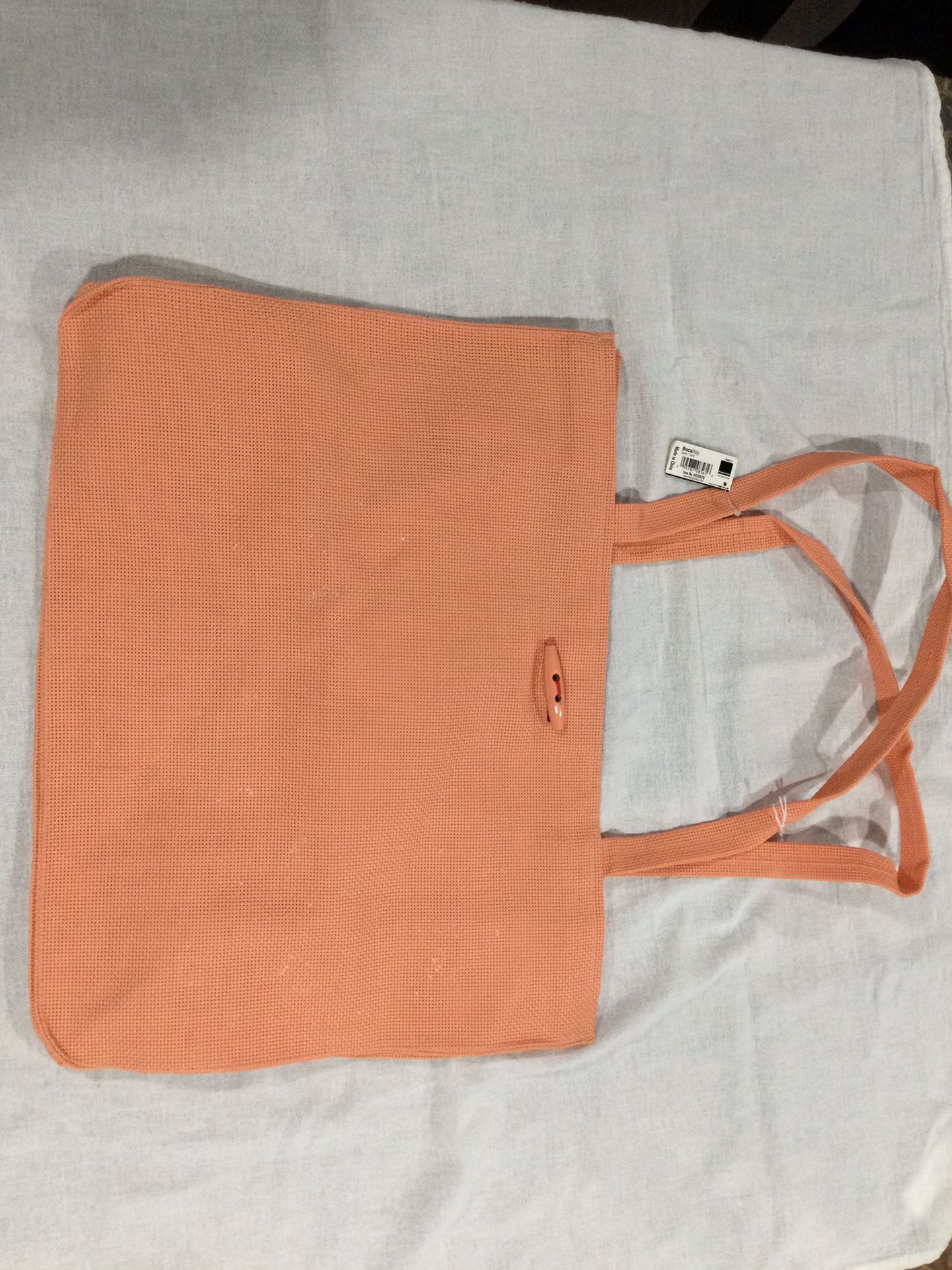 Orange tote. Feels like vinyl. Water proof. A good beach bag.