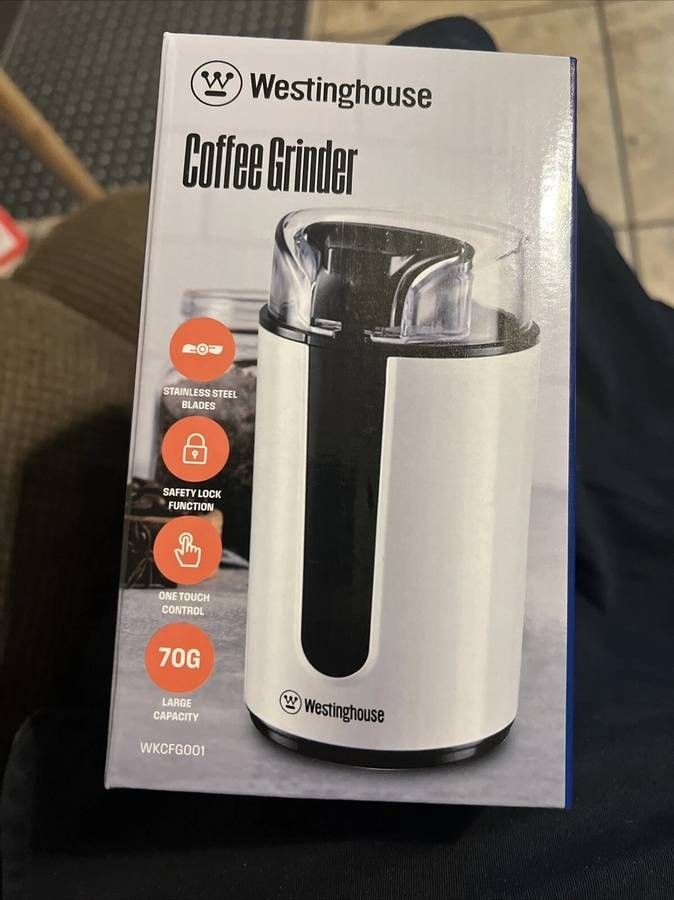 more ads by this seller Westinghouse Coffee Grinder Stainless steel blades Safety Lock Function One touch control Large Capacity I HAVE LOTS MORE POSTED, SO CHECK OUT MY OTHER STUFF! . . . . . coffee maker, machine, cafe, Mr coffee, cafe, creamer, lattee, espresso, bean, beans, starbucks