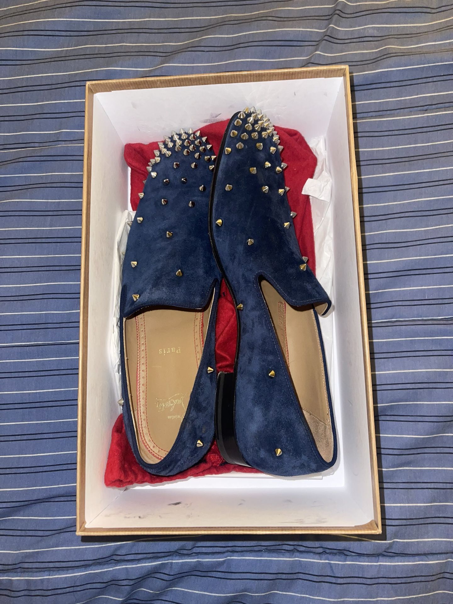 The red sole is essentially in excellent conditions as you can see. Worn very few times and has on a sole guard that protects the sole. Comes with box and both dustbags. 100% authentic. Size eu42