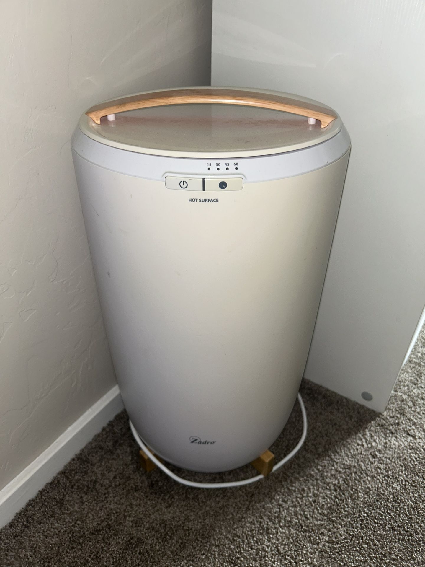 Works great. It is a little faded from the sun due to using it outside for the hot tub but doesn’t affect the quality of the heater. Different timer settings for how long you want it to be heated for. Gets very warm.
