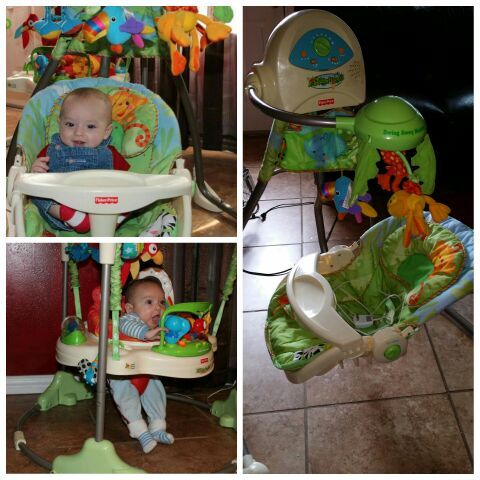 Swing swivels side to side or forward and back. Swing works with or without batteries / wall plug option. Both in great condition. Fisher price Rainforest swing retails for over $300 brand new and Fisher price Rainforest Jumparoo Bouncer retails for $90 brand new. Savings of $190...cute baby not included = PRICE REDUCED!