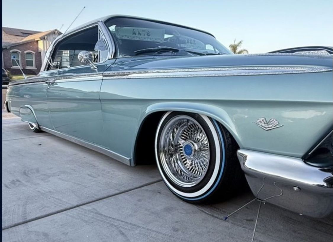 BRAND NEW SET with zero miles custom painted with a blue Vogue stripe and treated lowrider 1” whitewall tires , mounted and balanced on the high cost Cali 100 diamond cut spoke triple chrome , mounted balanced and ready to throw on any car . Size 13x7 front and 13x5.5 in the rear for those who need to rock with skirts ! This set cost me over $3200 so selling for good deal . Comes with standard set of new knock offs ( have a few sets of styles of knock off and chips to choose from , unless want to pay extra for the engraved Aztec hand made shark fins on last photo). And for some reason I have to say it , but NO it’s not the whole car for sale for this price ! WIRE WHEELS AND CUSTOM TIRES only totes C chrome 100 diamond spoke with knock offs adaptors and even a hammer with chips to choose from . That’s the whole wheel package for the best price you will find for a set like this ! . Cash and all weird and lowball messages won’t even get a reply back . Located in Bakersfield