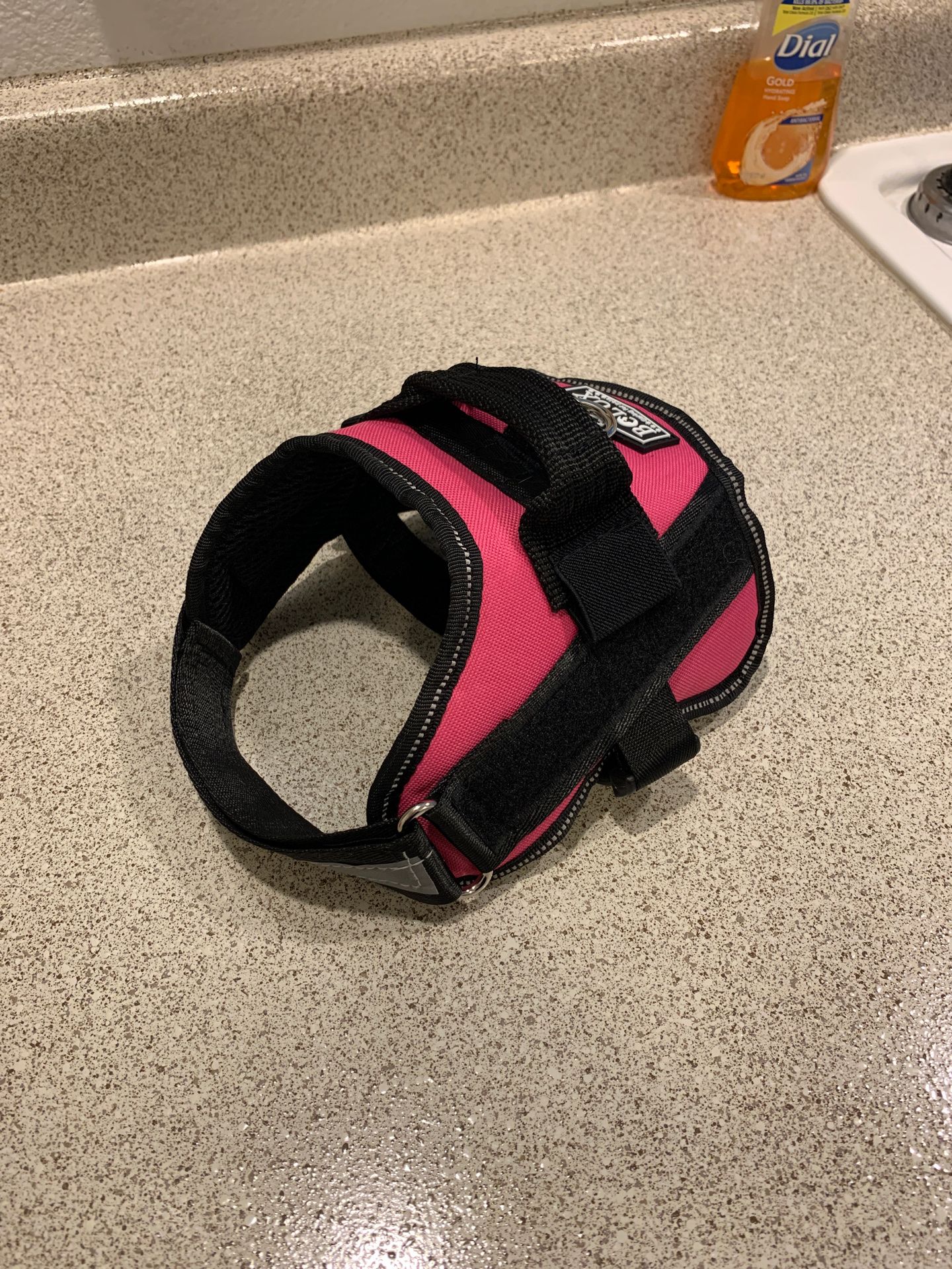 Never used Size SMALL Neck girth: 12.5-14” Chest girth: 16-18.5” Weight: 11-20 lbs Reflective, durable, adjustable straps. D-ring for easy attachment. Has two Velcro patches for names or service animal.