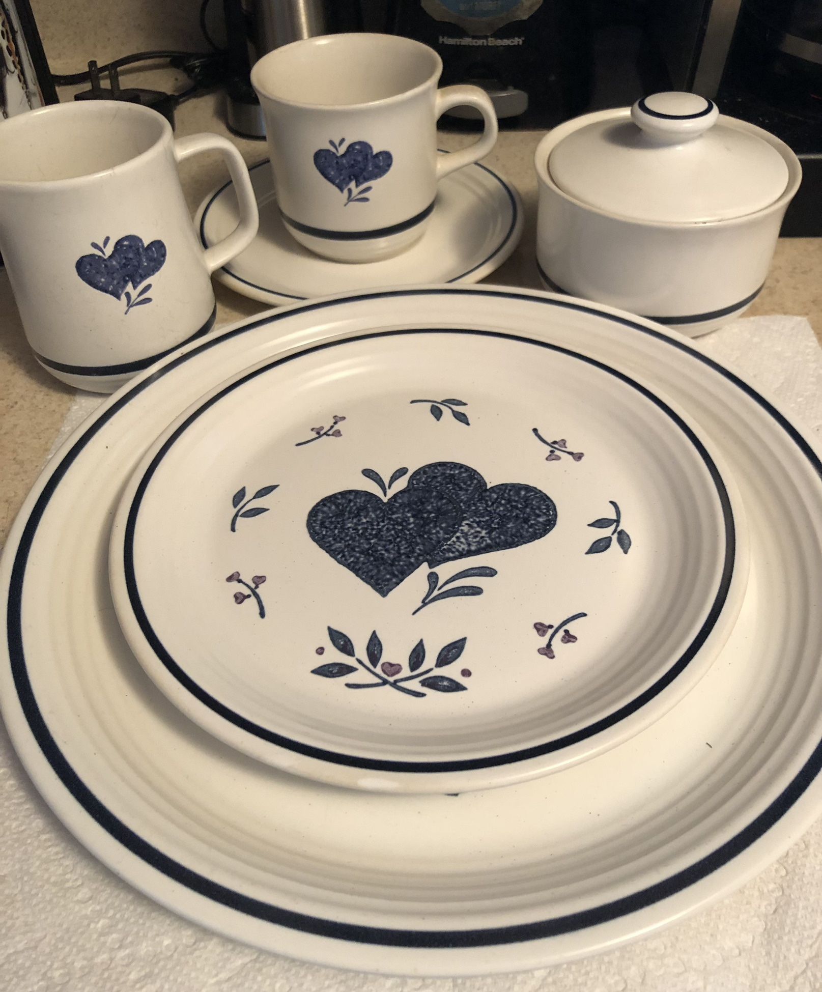 Blue and white heart design stoneware dish set for 4. Includes setting for 4 people, platter and serving dish