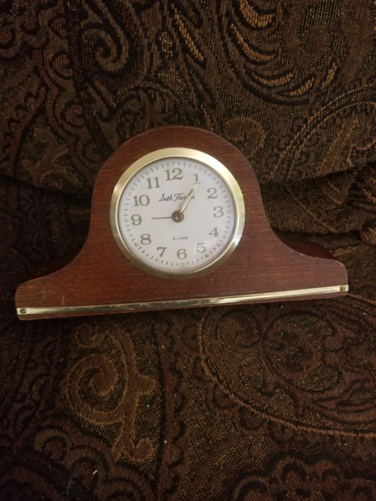 Used Seth Thomas mini-mantel windup clock and alarm. Fully working hour and minute hands no seconds hand but does have an alarm hand to set. White face clock with gold tone trimming. Some light scratches on the lower left front, can barley see but otherwise in very good shape.