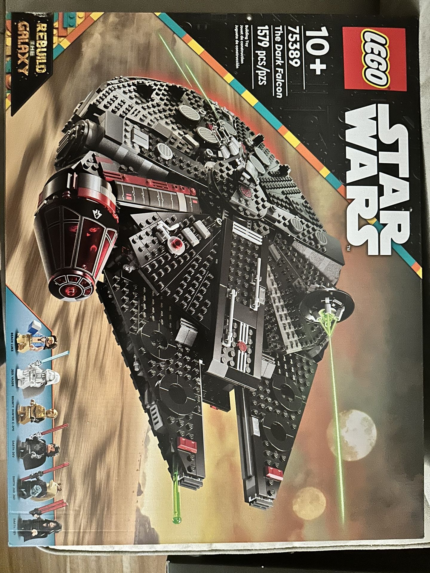 The LEGO Star Wars 75389 The Dark Falcon is a 1,579-piece set based on the dark version of the Millennium Falcon from the "Rebuild the Galaxy" special, featuring black coloring, red engines, and a Sith-themed interior with Darth Jar Jar's throne, a jail cell, and a command center. It includes 6 unique minifigures like Darth Jar Jar, Jedi Vader, and Beach Luke, plus play features like spring-loaded shooters and rotating cannons, offering an accessible interior through flip-up panels for creative play.