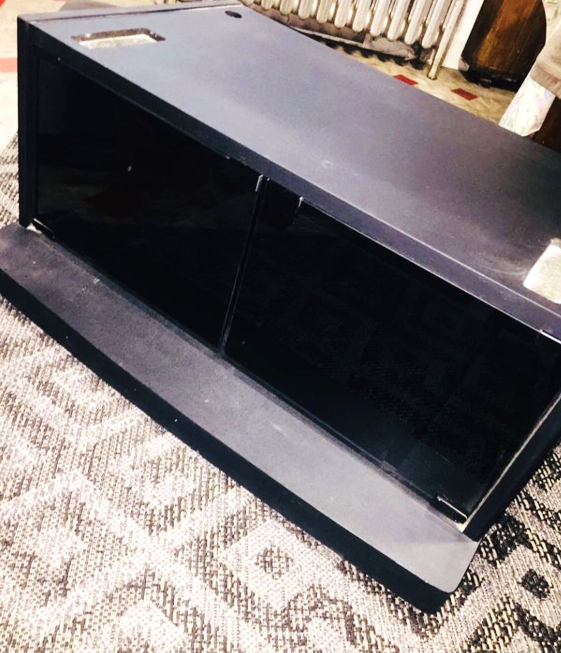TELEVISION STAND in BLACK FORMICA GLASS BOTTOM DOORS CASTERS 29 X 17x 14