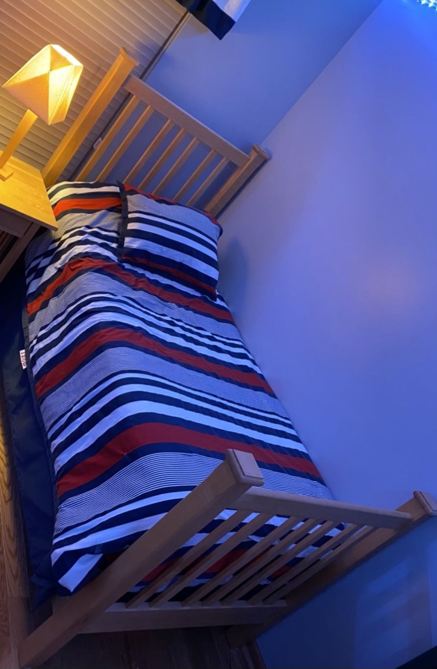 It's really clean in perfect condition including bed , dresser,bed side table Maple salid wood natural color