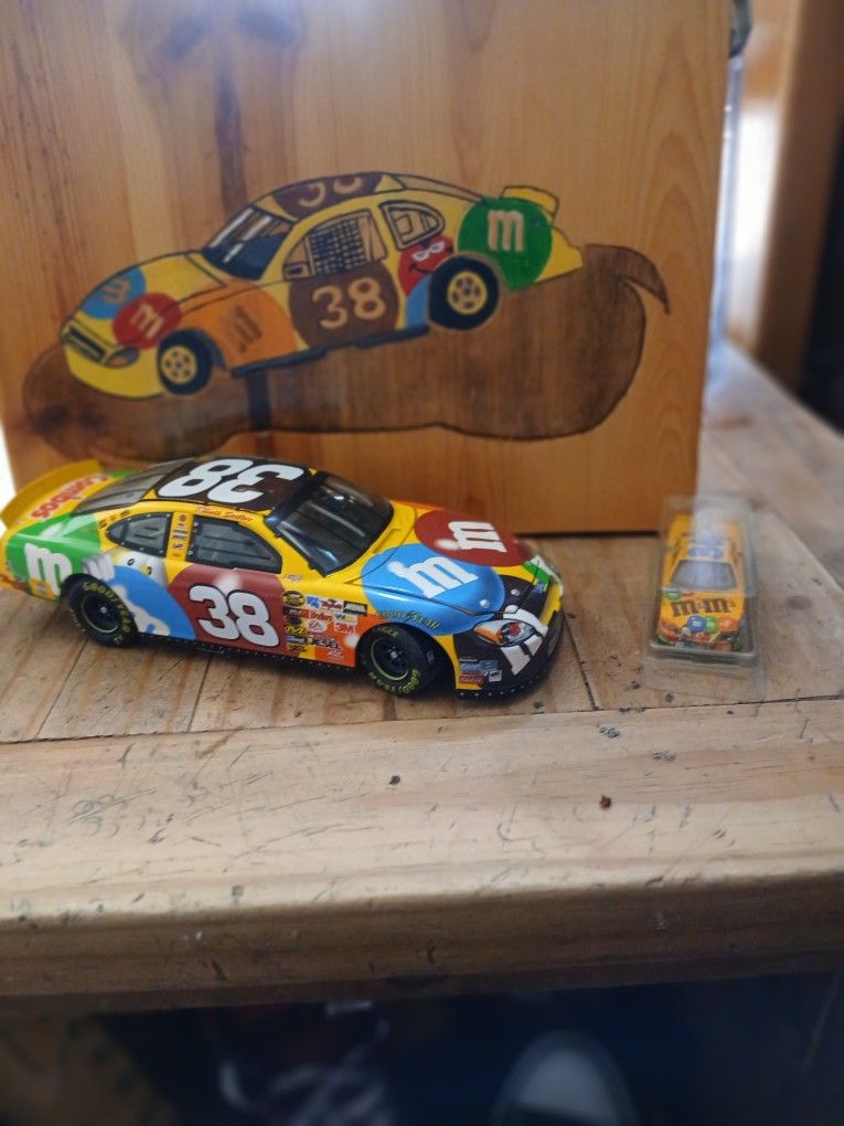 Comes with the m &m Nascar car with wood drawing handmaid. 2 m&m candy dispensers