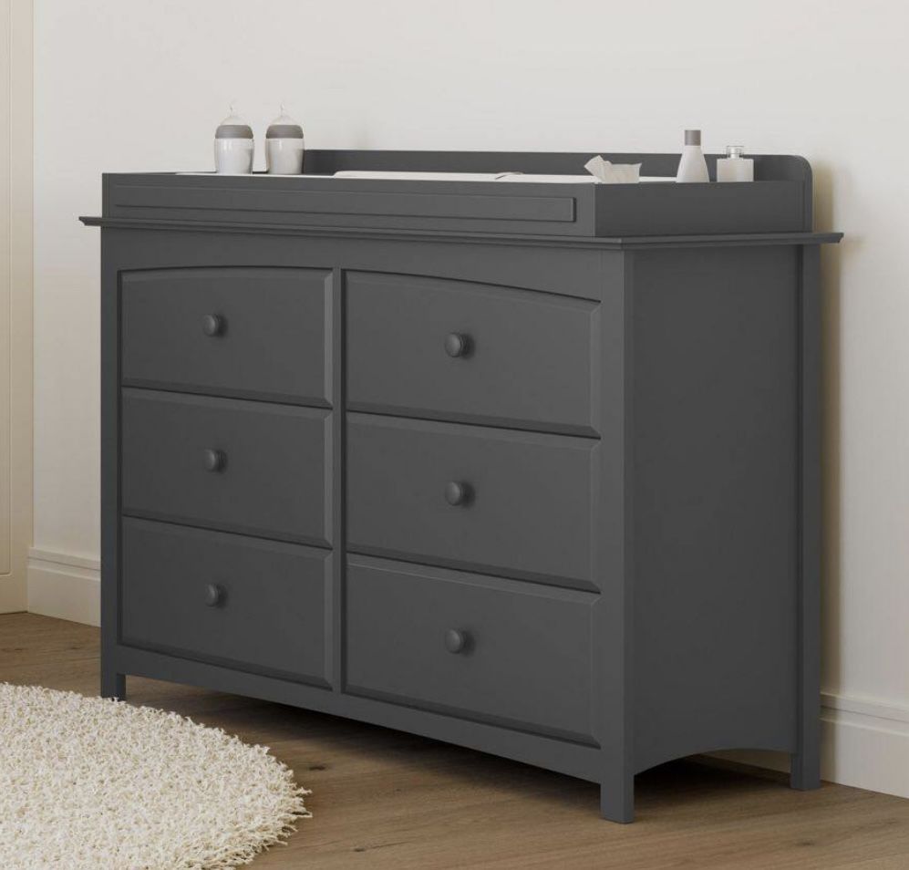 6 drawer double dresser (Gray) includes changing topper. Crafted of wood framing and wood composites, and includes Euro drawer glides.