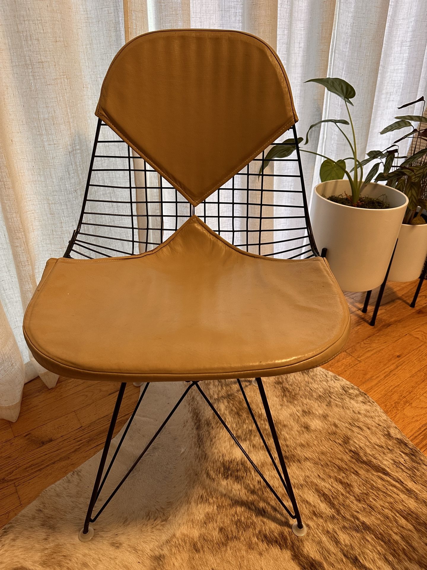 Vintage Eames Black Wire Eiffel Chair with Beige Leather Bikini Cover. MSRP $1545. Part of an international moving sale. Please explore our other items for deals on bundles!