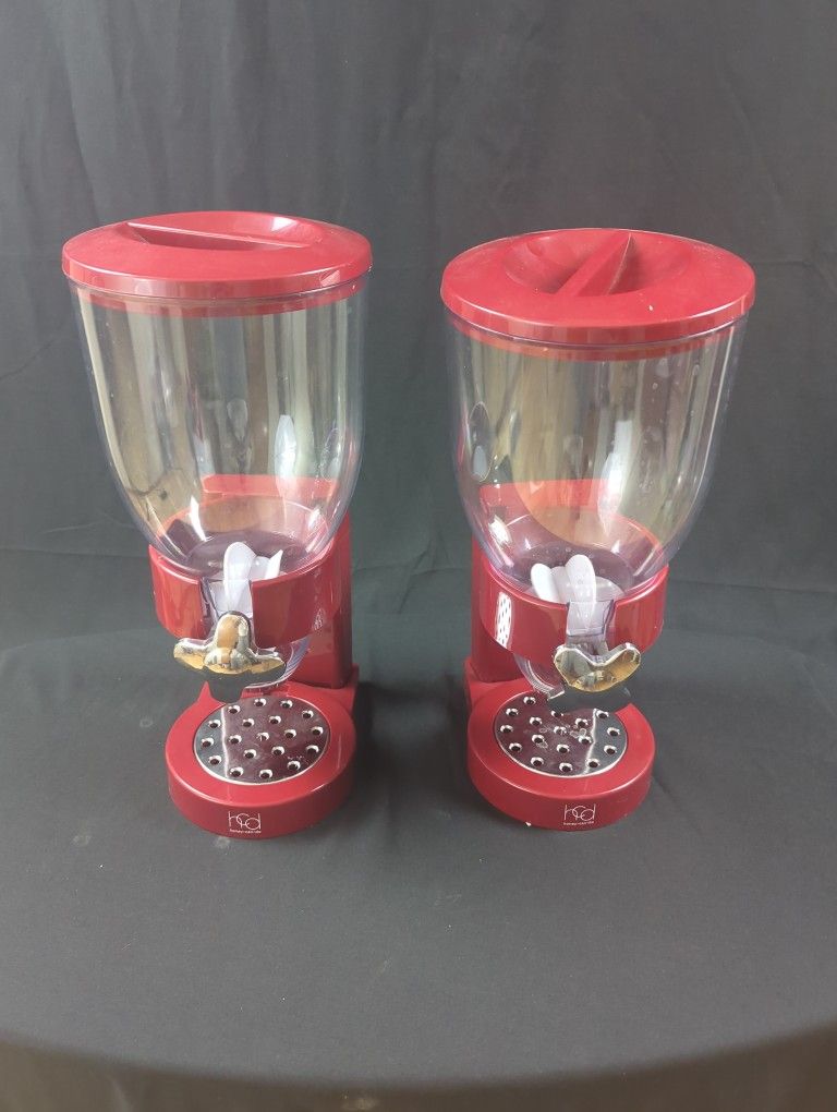 Set of 2 cereal dispensers, burgundy/red color. Easy to use twist handle, keeps cereal or snacks fresh. Lightly used, both in good working shape, only used a few times. Easy to take apart and clean.
