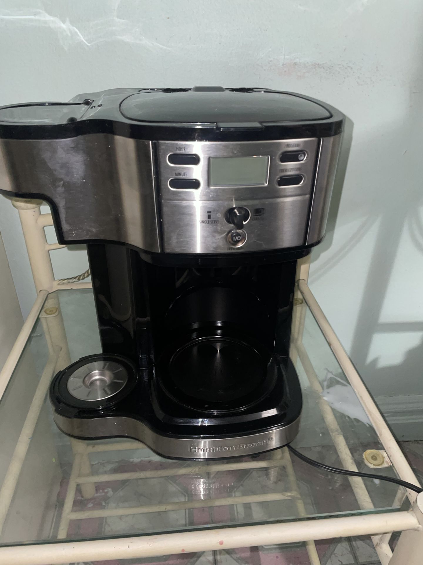 Fully working Hamilton Beach programmable coffee maker. 12-cup glass carafe + single serve option. Digital clock and timer function. Brews fast and keeps coffee hot. Cleaned and tested. Pickup only.