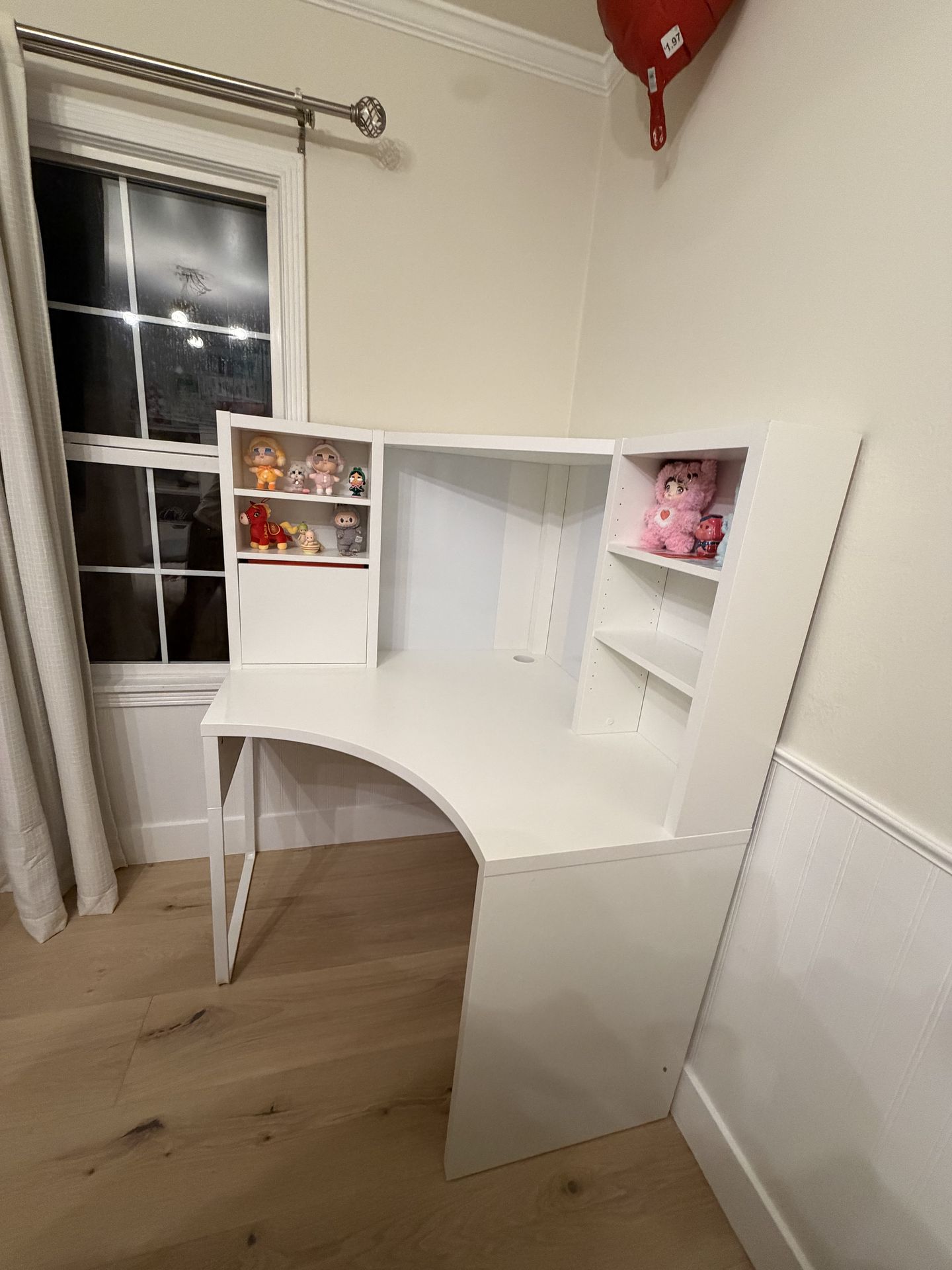 Hello! This desk is a really nice desk. I wish I could keep it but it will no longer fit in my room. :( Please let me know if you are interested in buying this. I will set a price but since I need it to go quickly im willing to negotiate with prices. I also have a pink pink rolling chair that went along with the desk I could also include for a little more. Thank you