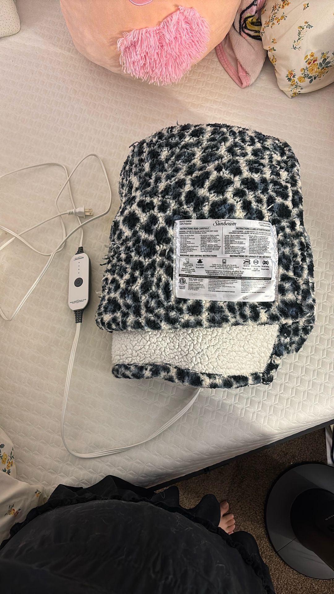 Heating blanket purchased last year but i need a bigger one now. Has auto off after 4 hrs! Size of blanket TWIN SIZE. Its cheetah print so cute. PUO!!