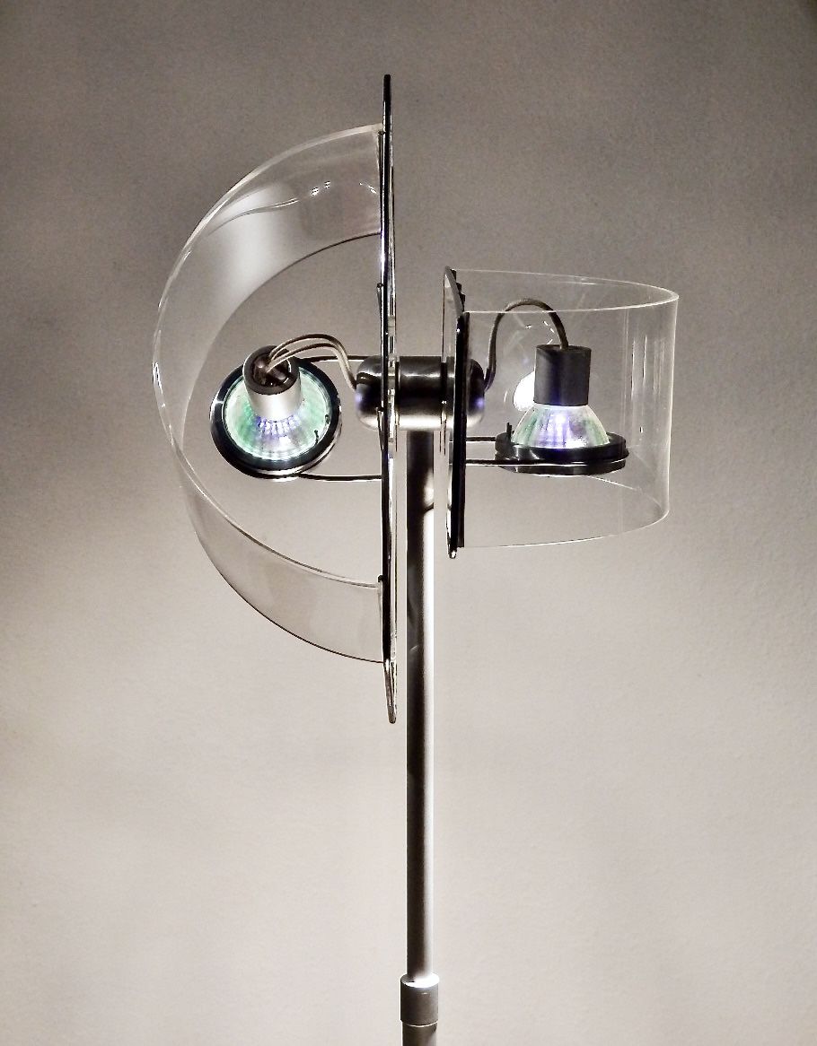 Designed by Pablo Pardo Manufacturer- Pablo Designs Gloss adjustable 19”-29” table lamp Features Full-range dim (in-line rotary dimmer) 350° dual-shade tilt range 360° shade rotation Up to 10” height adjustment Materials: Acrylic shade, machined aluminum base and stem.