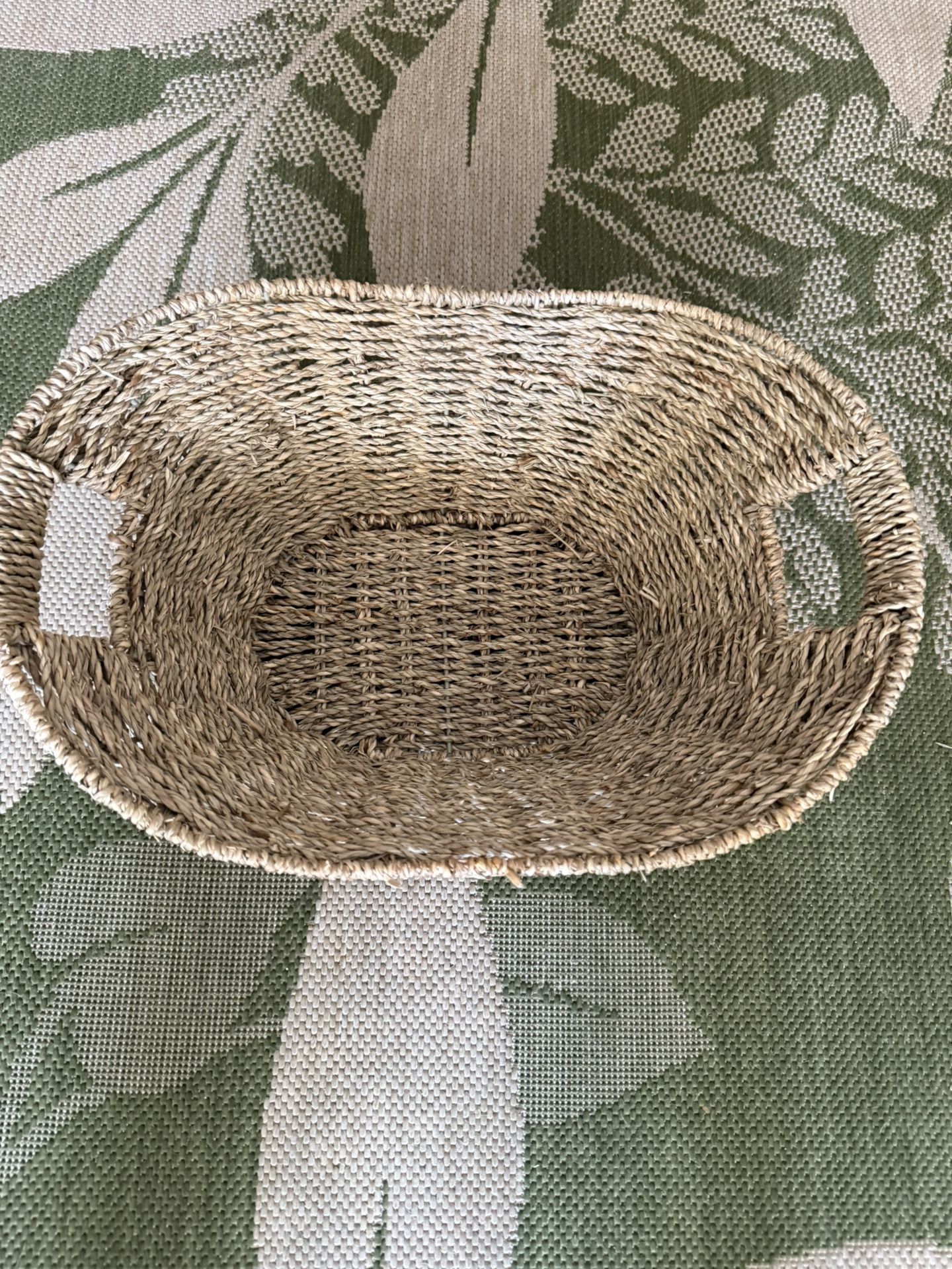 This is a great basket. It is woven around pieces of metal so it is sturdy and sits nicely. It would be great for a gift basket or something that you want to put things on your counter in. Measures of approximately 16“ x 12 inches and is approximately 8 inches deep so this is good size. Open in South Temecula