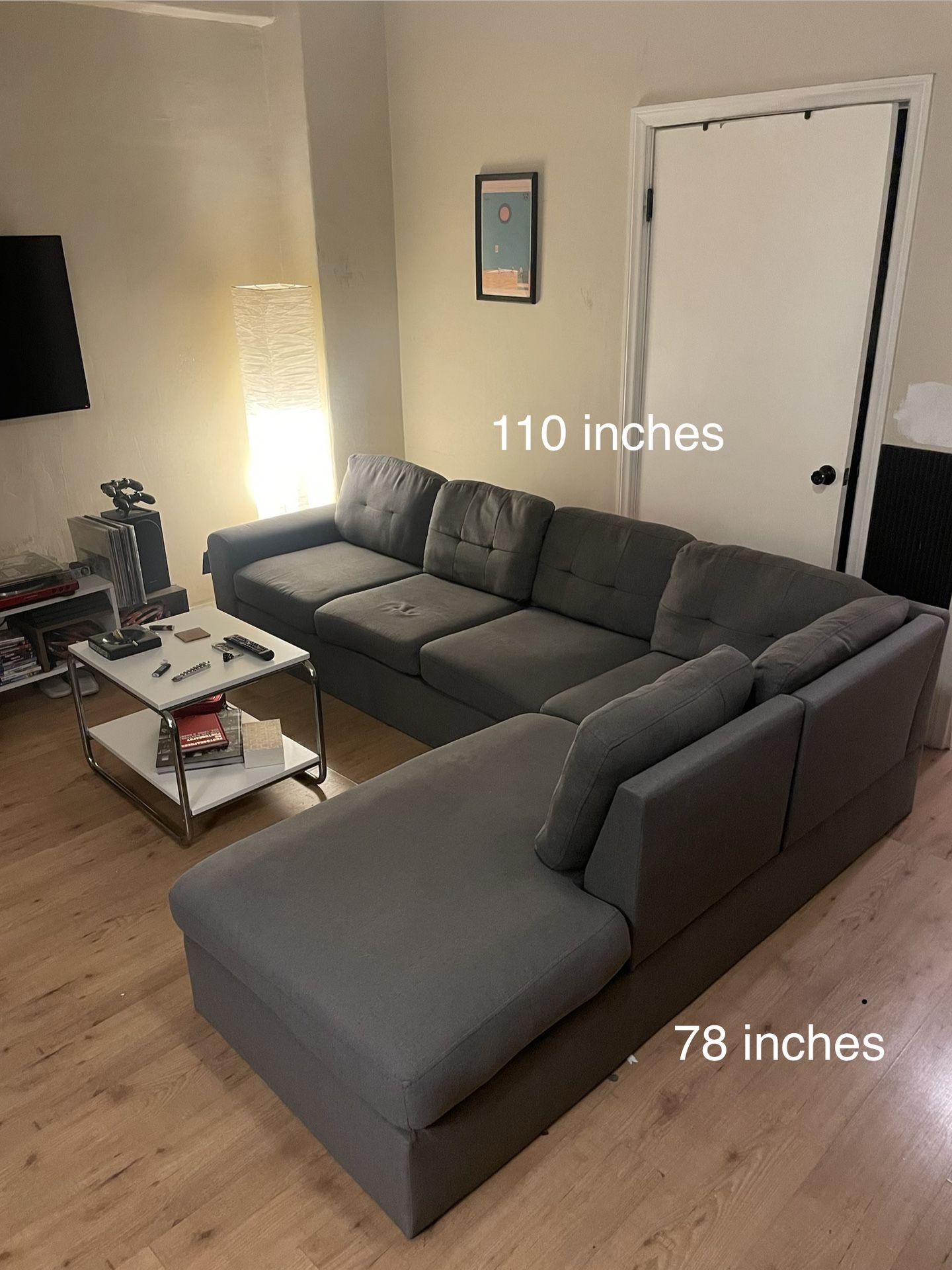• Grey sectional couch. • Have had over 5 years. Nothing wrong with it just got a new couch. Normal use as expected from a couch 5+ years old. • Does not have legs. Sits flat on floor like seen in photo • No pets, no smell, no smoke, no stains. • Seat cushion covers are removable and can be washed. Back pillows can not. • Couch is disassembled and ready for pick-up 110 inches wide 78 inches long