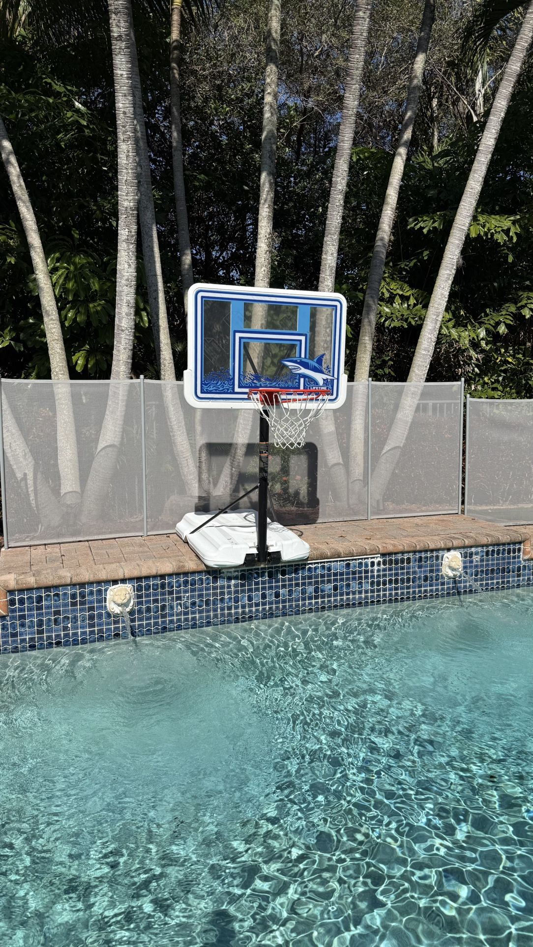 Lifetime Shatterproof Fusion Backboard 4-6.5 ft Poolside Basketball System • 44-inch Shatterproof Fusion™ Backboard for exceptional durability and rebound • Heavy-duty portable base can be filled with sand or water for stability • Double-powder coated Classic Slam® Rim resists water and withstands elements • Stainless steel hardware prevents rust and fading • All-weather net ensures longevity for regular use near the pool