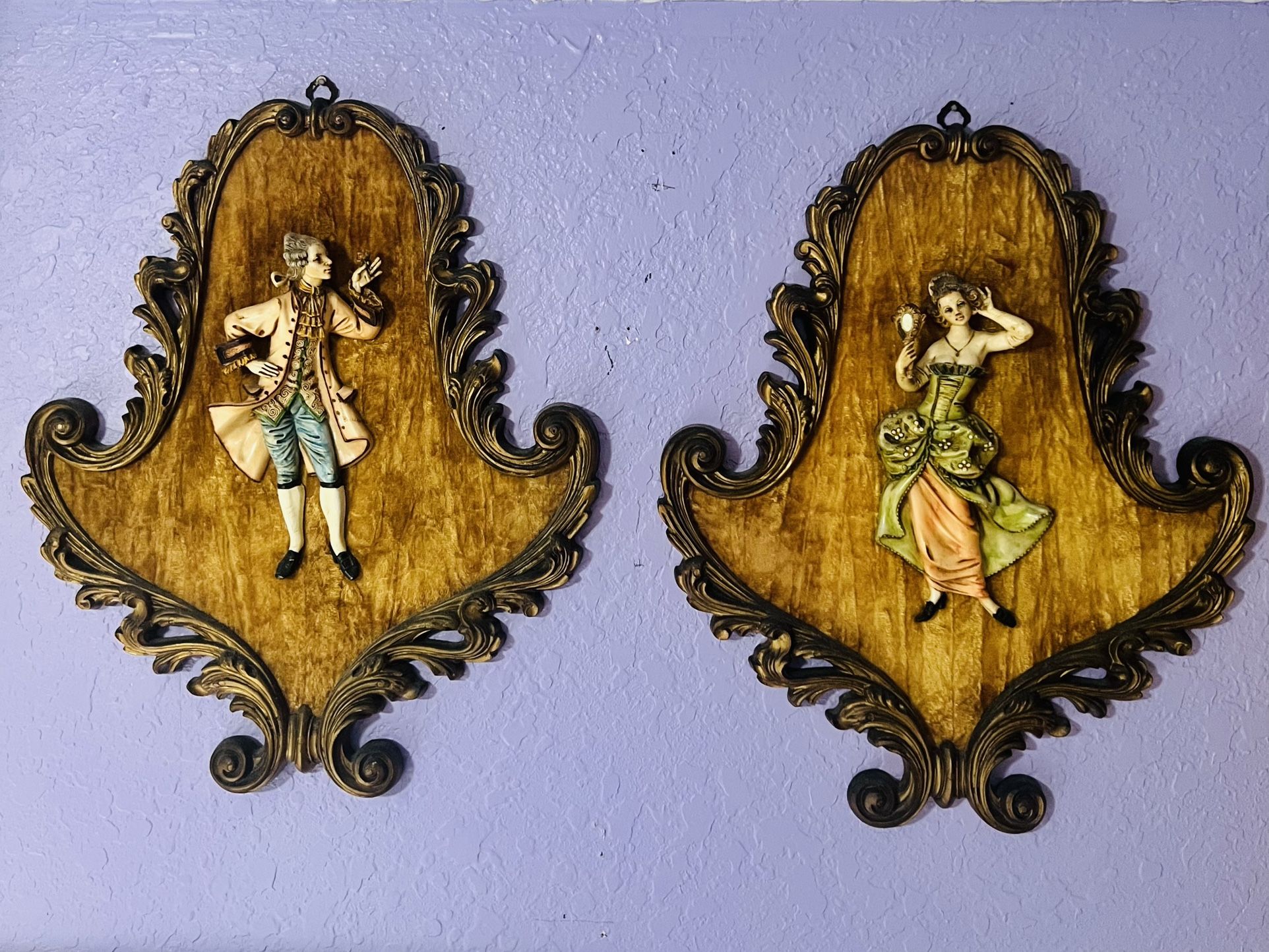 vintage Italian Baroque Fontanini Depose wall plaques featuring 3D figures in ornate frames.