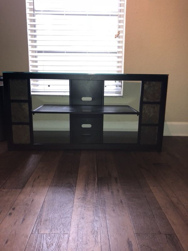 Gorgeous black and brown tv stand with a glass top to protect from scratches and easy to clean.. only had for three months !!