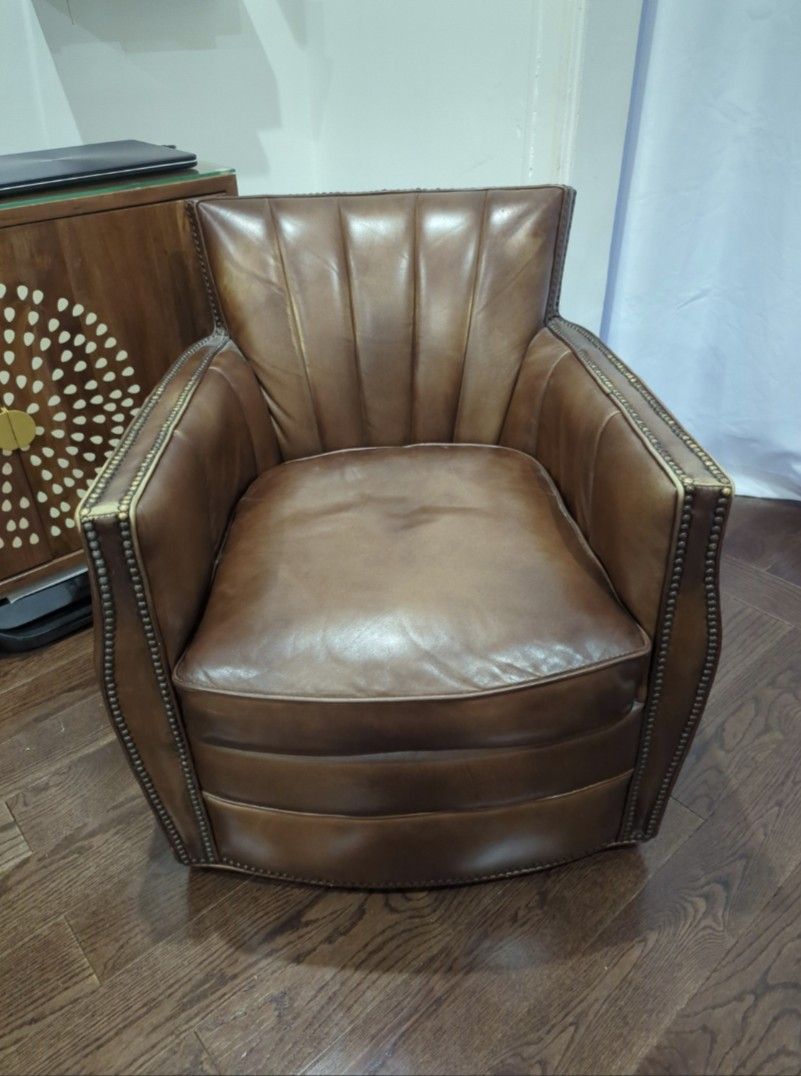 Brand: Hooker Furniture Corporation Manufacturer Link: https://offerup.com/redirect/?o=aHR0cHM6Ly93d3cud2F5ZmFpci5jb20vZnVybml0dXJlL3BkcC9ob29rZXItZnVybml0dXJlLWNhcnNvbi0zMC13aWRlLXRvcC1ncmFpbi1sZWF0aGVyLXN3aXZlbC1jbHViLWNoYWlyLWhrcjEyNTQ0Lmh0bWw/cGlpZD0yMjI3MzQ0NA== Condition: Used - Good: Minor blemishes that most people won't notice Wear and tear details: discoloration Age: 6 Years Old Overall Dimensions: Width: 33 inches, Height: 31.5 inches, Depth: 30 inches