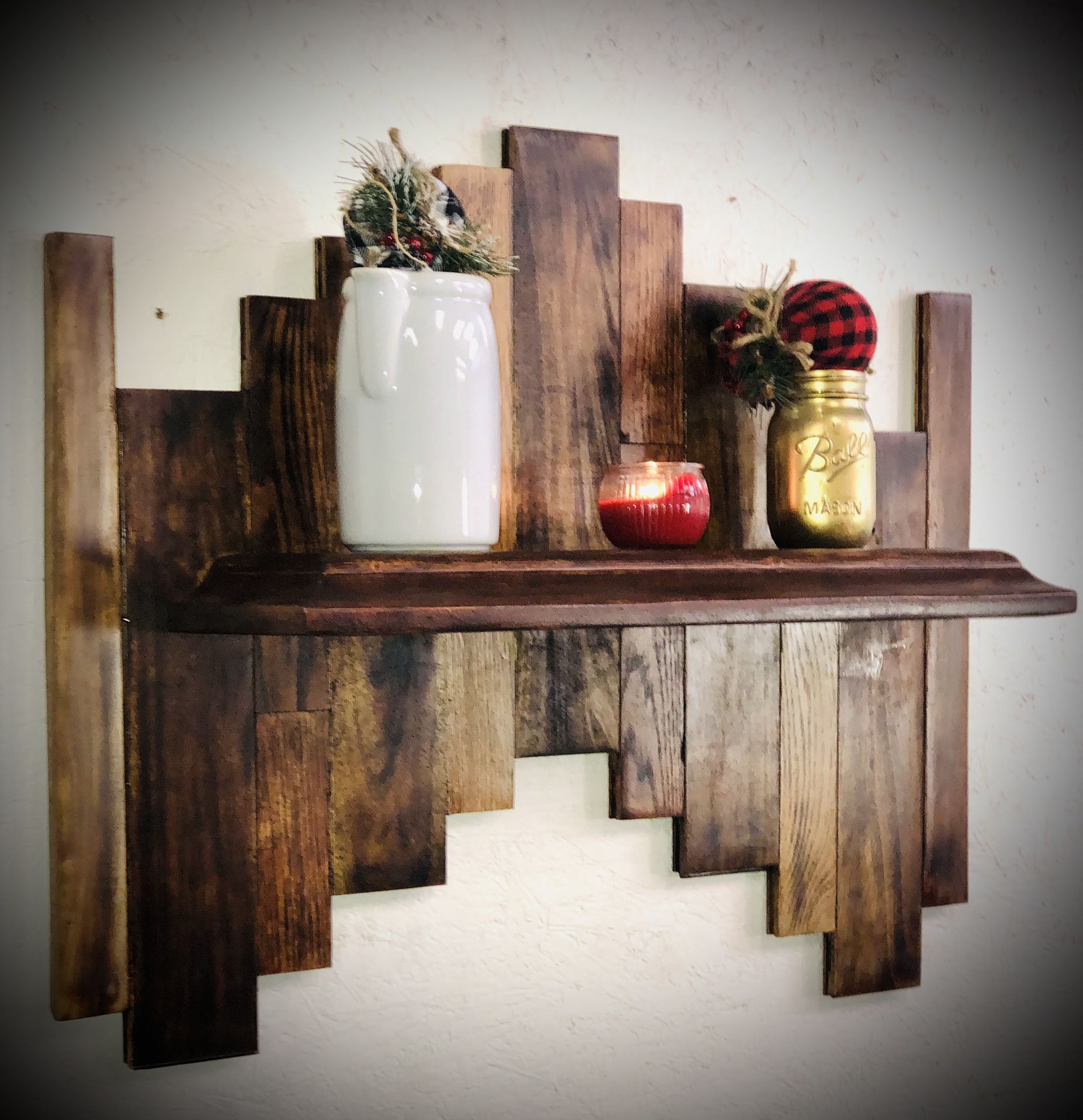 Beautiful brand new handmade wall shelf made up of three different wood stains and finalized with a basic clear stain for protection and sealing. Pretty heavy and medium in size, can hold quite a bit on actual shelf. Wall holders attached for easy hanging. Dimensions are as follows: 31 inches length, 27 inches height and 9 inches width. Please see photos for more details or message me with any questions thanks!