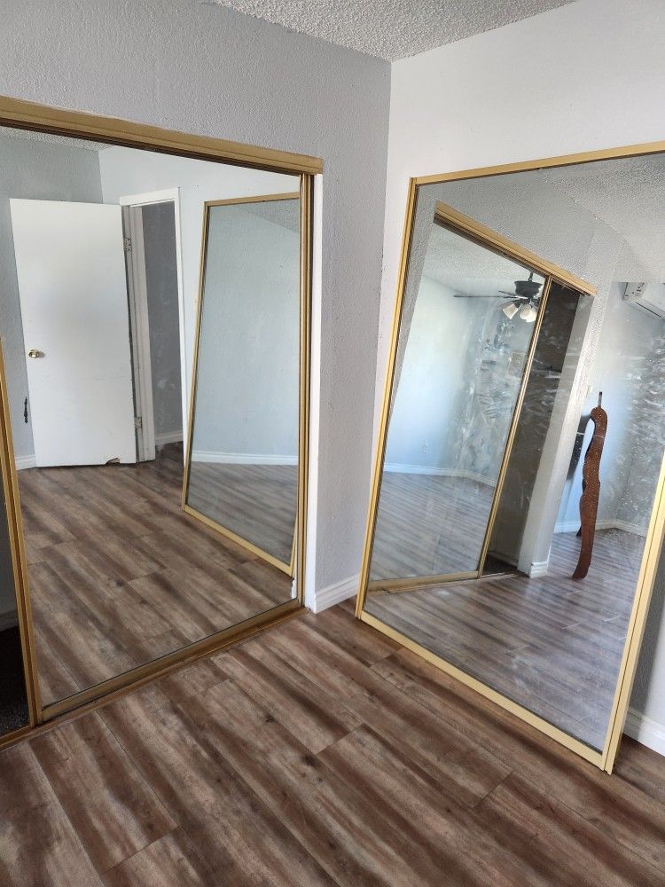 Gold frame closet mirror with gold track and glide all included. Good condition just simple smudges on mirror.