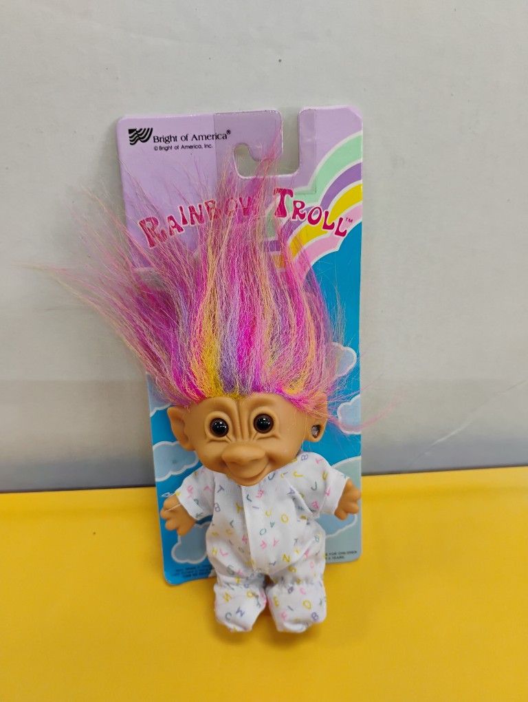 Vintage 1990s Bright of America Rainbow Troll doll features multicolored hair and is packaged with a white onesie covered in a colorful alphabet patte