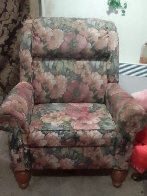 this is a beautiful flowered recliner that does have little damage from the cats as seen in the pics. seat cover would take care of that but that is the reason for the low price. if it is listed it's available.