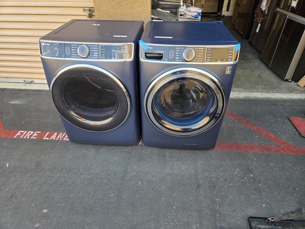 New open box never used In mega capacity washer is 5.3 cuft Dryer is 7.8 cuft in shappire blue Plus 3 months warranty Delivery available or pick up same day