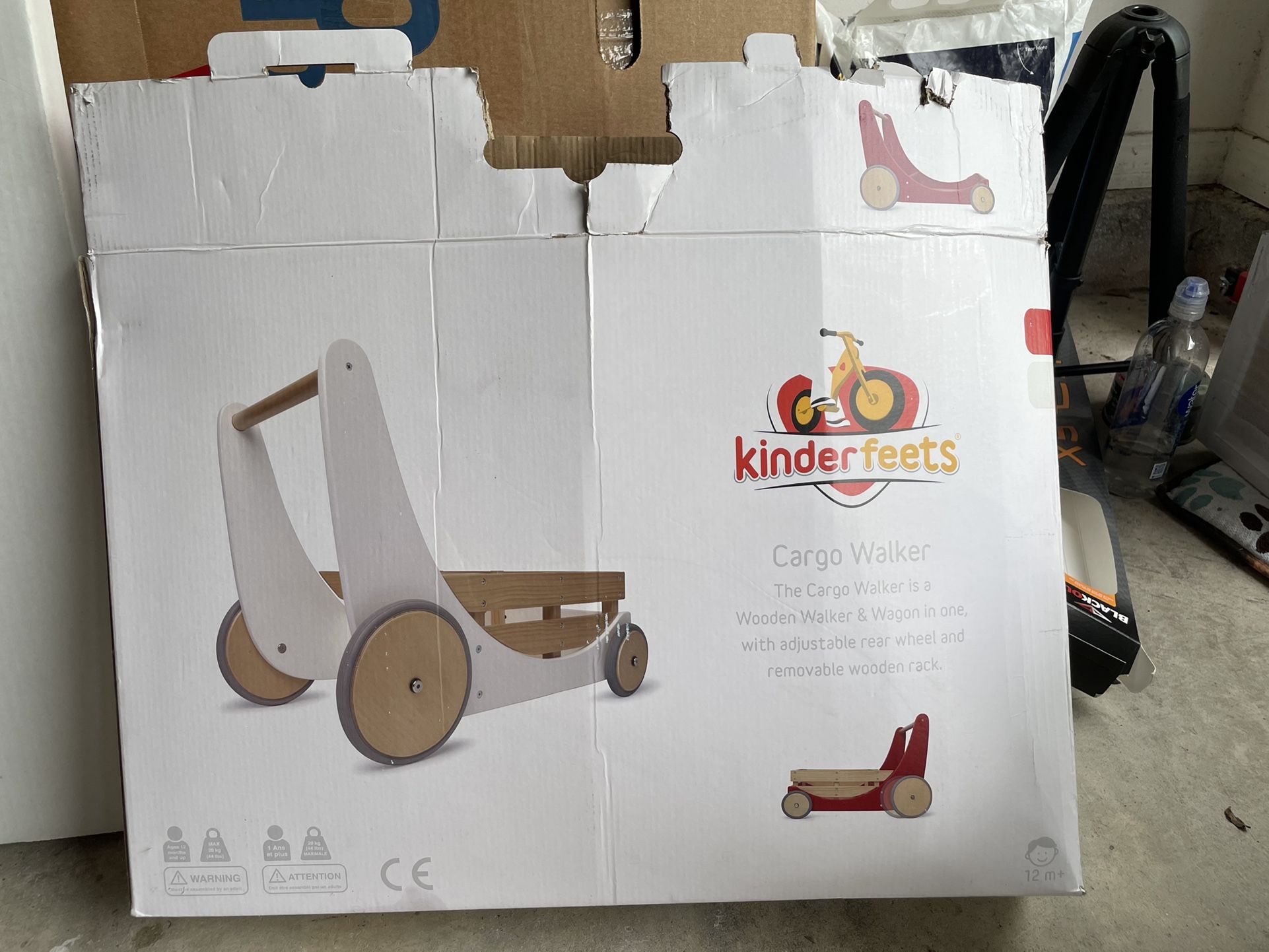 Open box, unused, unassembled. Wooden Cargo walker for toddlers.