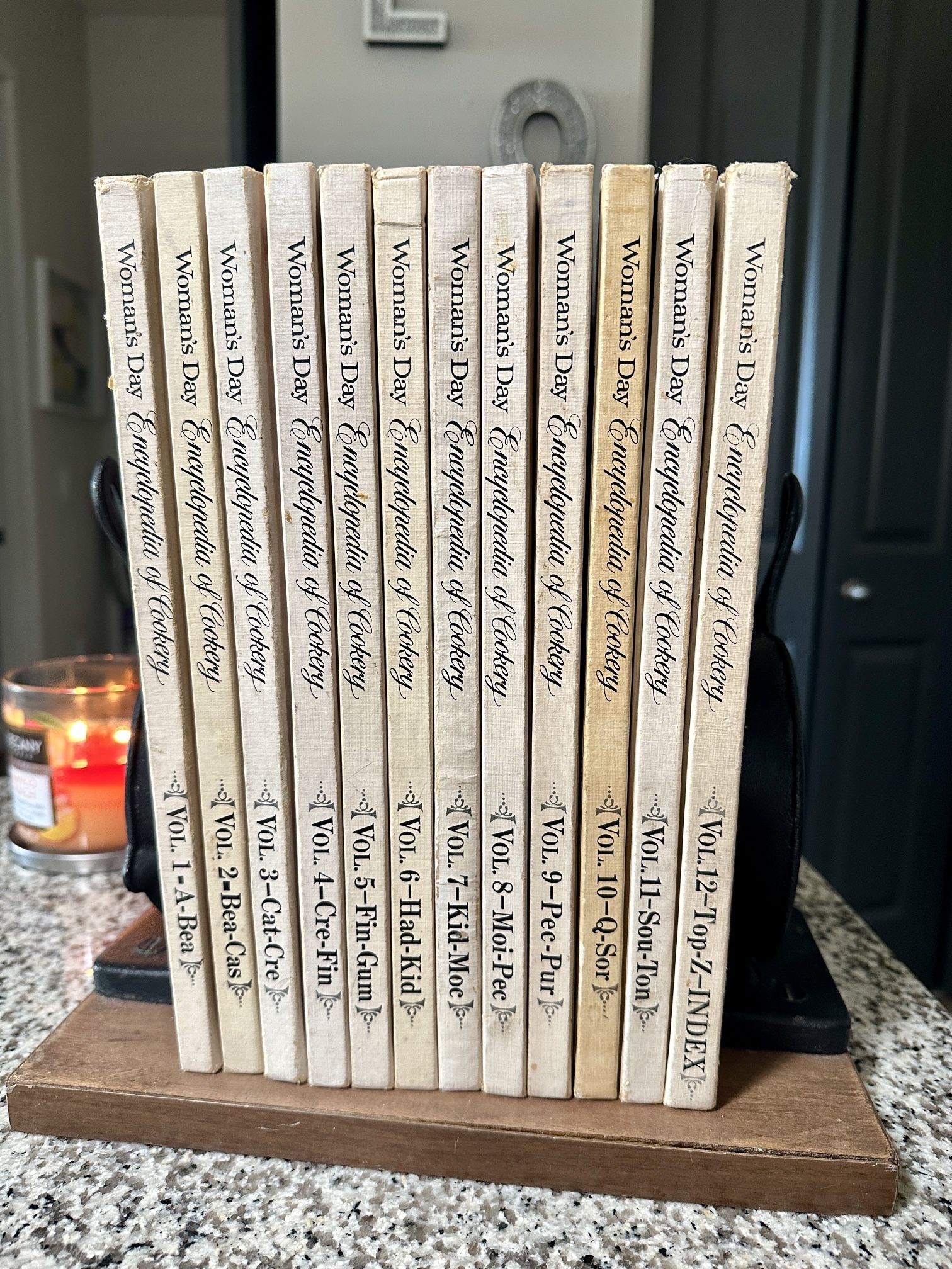 Vintage Woman’s Day Encyclopedia Cookbook 12 Volumes With Cast Iron Skillet Book Holder