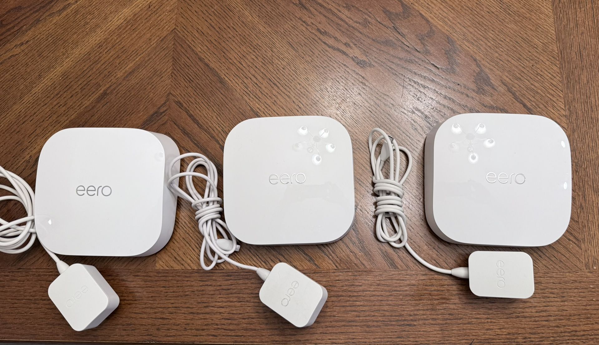 Upgrade your entire home to Gigabit+ speeds. I’m selling my Eero Pro 6E 3-pack mesh system in excellent condition. This is the "Pro" model with the newer 6GHz band, which is way faster and more reliable than standard Wi-Fi 6. Why this system? • Massive Coverage: The 3-pack covers up to 6,000 sq. ft.—no more dead spots in the garage or upstairs. • Insane Speeds: Supports network speeds up to 2.3 Gbps (1.6 Gbps wireless). • Future-Proof: Access to the 6GHz band means your new iPhones, Galaxies, and MacBooks will run at their max potential. • Device Heavy: Handles 100+ devices simultaneously without breaking a sweat. • Smart Home Ready: Built-in Zigbee and Thread hub to connect your smart lights and locks directly. Condition & Details: • Units have been factory reset and removed from my Eero account (ready for immediate setup). • Comes with all 3 power adapters. • Non-smoking home, very clean