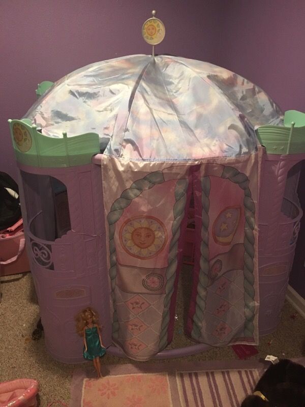 Sadly my daughter has decided she has grown out of her Barbie My Sized Pegasus Castle. This thing is HUGE and has always been so fun for my daughter and her friends. It is well made, thick plastic frame and nice fabric. Each tower (4 total) has an upstairs and downstairs. It is tall enough for kids to stand in without having to duck down. And my daughter would have one or two friends playing comfortably inside of it. In the pictures I put some barbies and cars and pool to show the size scale. It comes apart easily. My daughter would have a friend spend the night and two of them with sleeping bags, pillows and 2 little girl bodies could fit to sleep comfortable inside of it like a little fort. I am actually kind of sad she is ready to part with it but she wants to sell it so she can buy a futon for her playroom to watch movies and play video games on when friends come over. It has a little bit of wear from playing but overall still in very good condition.