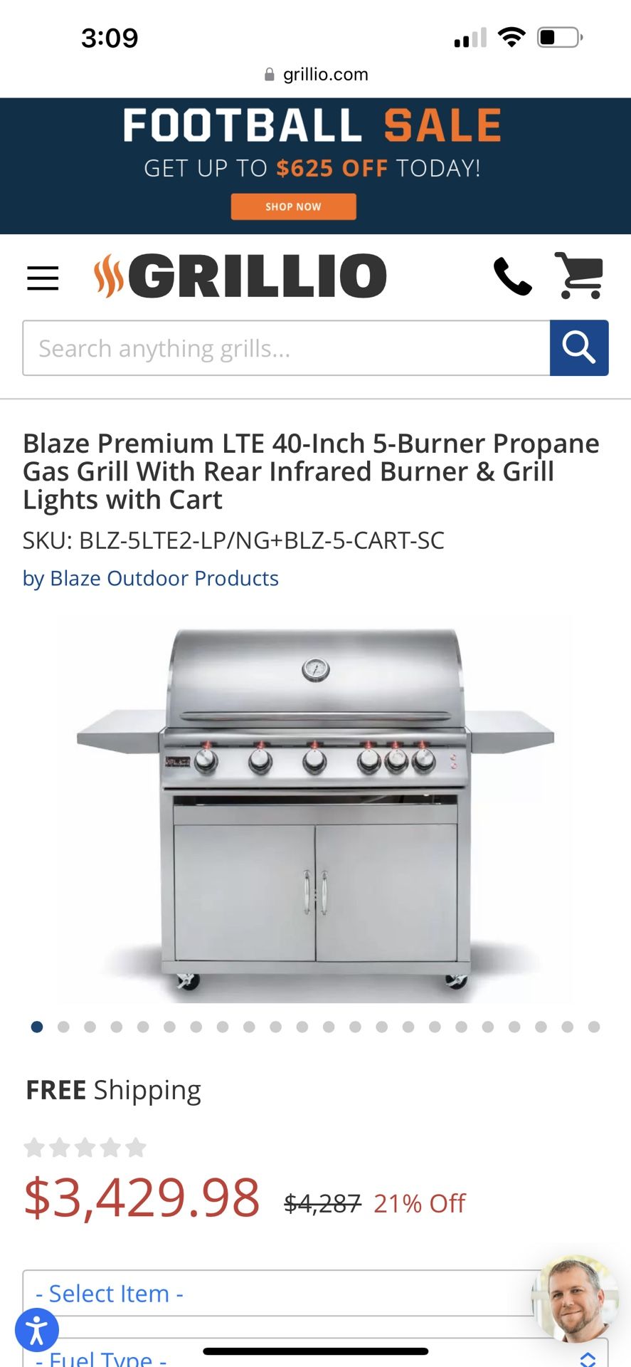 Blaze Premium LTE 40-Inch 5-Burner Propane Gas Grill With Rear Infrared Burner & Grill Lights with Cart