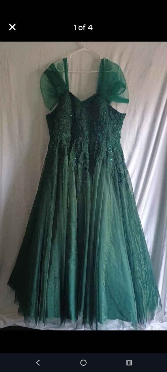 Make a bold and elegant statement in this breathtaking emerald green gown by JVN by Jovani, a brand known for its high-quality and show-stopping designs. This floor-length dress is beautifully made with intricate floral lace embroidery, delicate sequins, and layers of flowing tulle, giving it a romantic and glamorous look. Details: Brand: JVN by Jovani Size: 24 (Plus Size) Color: Deep Emerald Green Material: 100% Polyester Care Instructions: Spot clean only – Do not wash or dry clean Condition: Gently worn, in excellent condition with no rips, stains, or missing embellishments Closure: Back zipper Straps: Adjustable tulle shoulder straps for added elegance and support This gown is ideal for: Prom Military ball Pageants Black-tie weddings Quinceañeras or sweet sixteens Price: $50 Cash only Pickup is in Aurora near Aurora university.