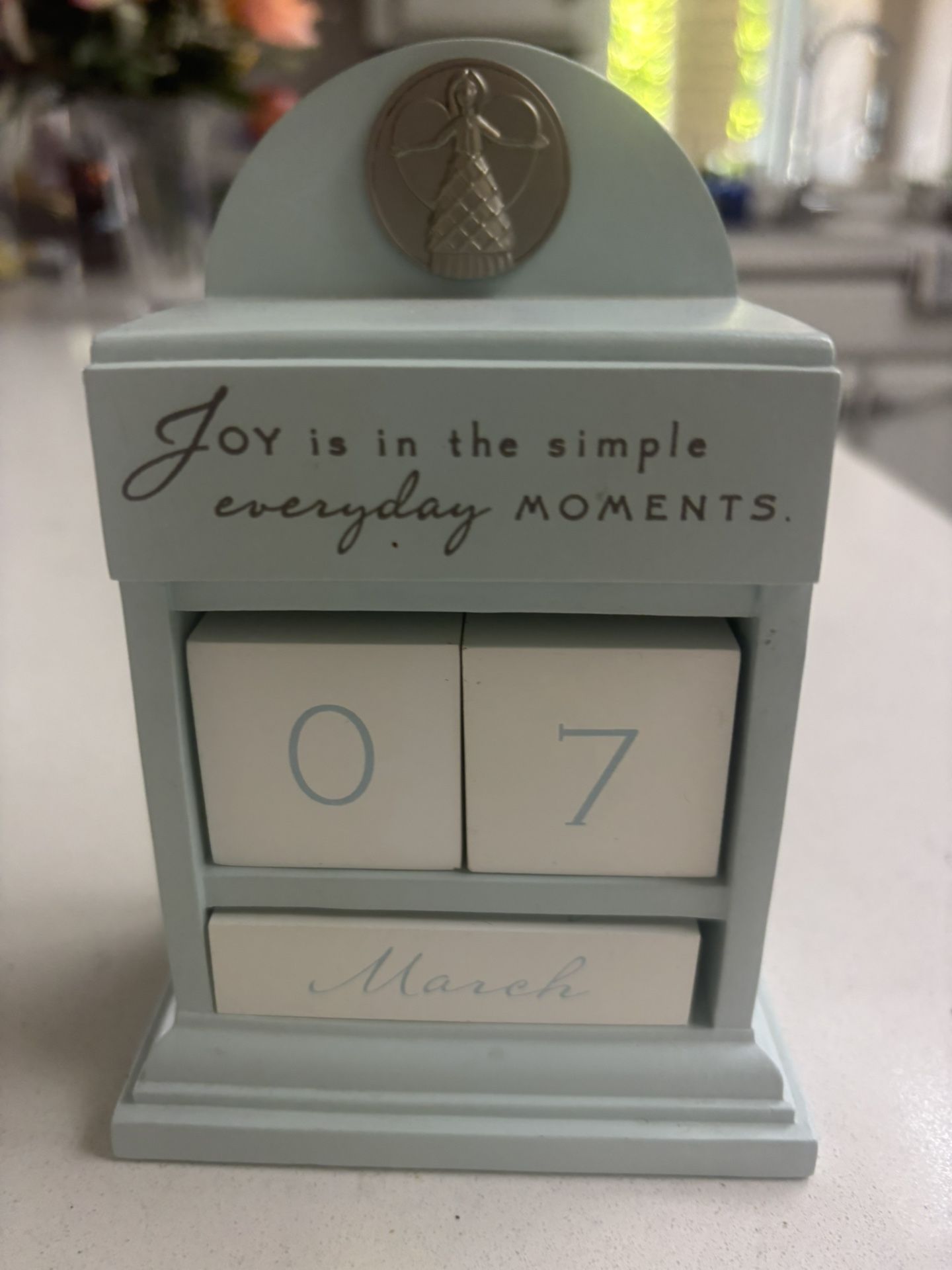 Baby blue color. The phrase “joy is in the Simple Everyday Moments “. Interchangeable blocks to display date and month indefinitely. 4.5” to top shelf. Base is 4”x 2.5”. CASH ONLY