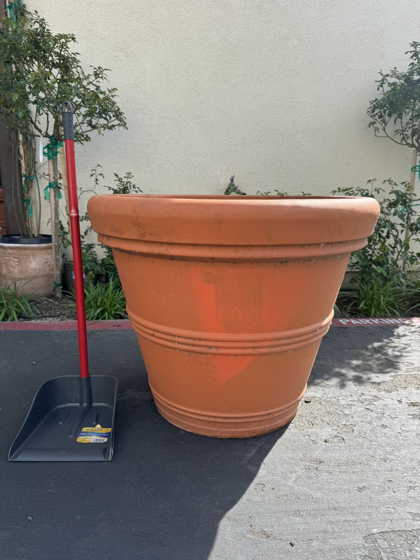 A huge high-quality fade-resistant plastic pot that is lightweight with holes. I used this pot to plant my fruit tree. Sturdy and durable. Approximately about 30” wide and 24” tall. For pick up only. 30 gallons capacity.