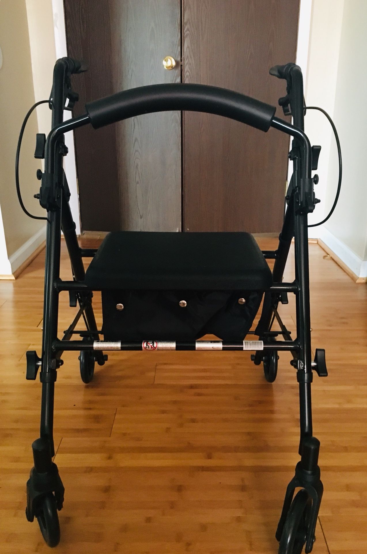 - Ergonomic handles with loop-style brakes are adjustable in one-inch increments from 29-1/2” - 38” with self threading knob - Height adjustment on frame allows seat height to be adjusted in one-inch increments from 18” - 22” - 6-inch non-marring black wheels with soft grip tires glide on almost any surface