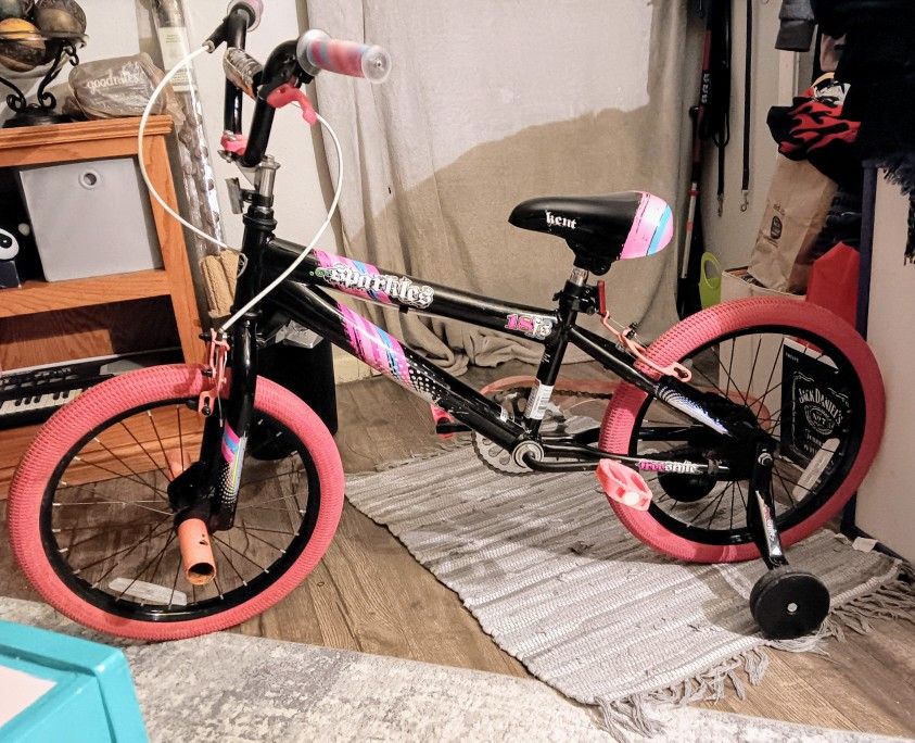 Nice kids bike with removable training wheels Black/hot pink accents 18" tires Age recommended: 5 to 8 years old Front hand brakes back coaster brakes