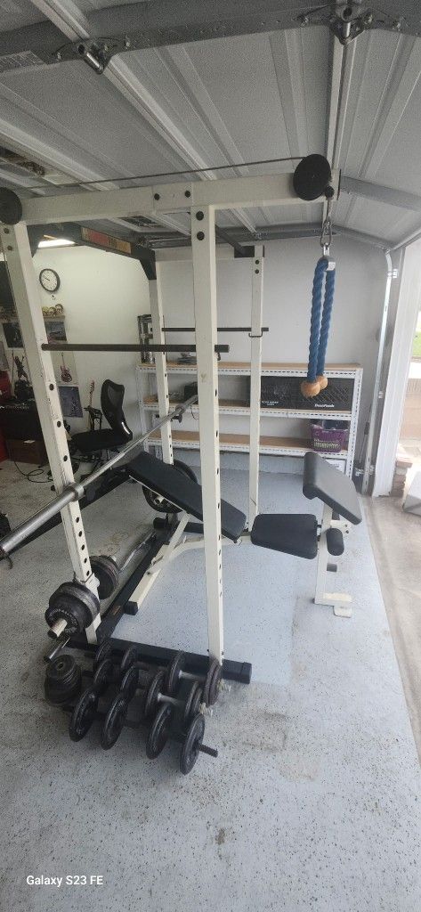 Squat Rack/ Bench Press - 335lbs of Olympic weights and Curl bar, plus 3 sets of barbells and 100lbs of weights