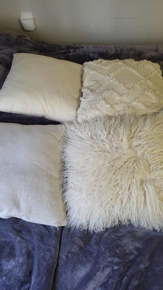 Selling four decorative pillows in cozy boho style. One is a diva made of 100% natural sheep’s wool — soft, stylish, and with attitude. The other three are just in need of a little spa day (a quick wash), and they’ll be fabulous again. Together they look like they just stepped out of a home décor magazine.