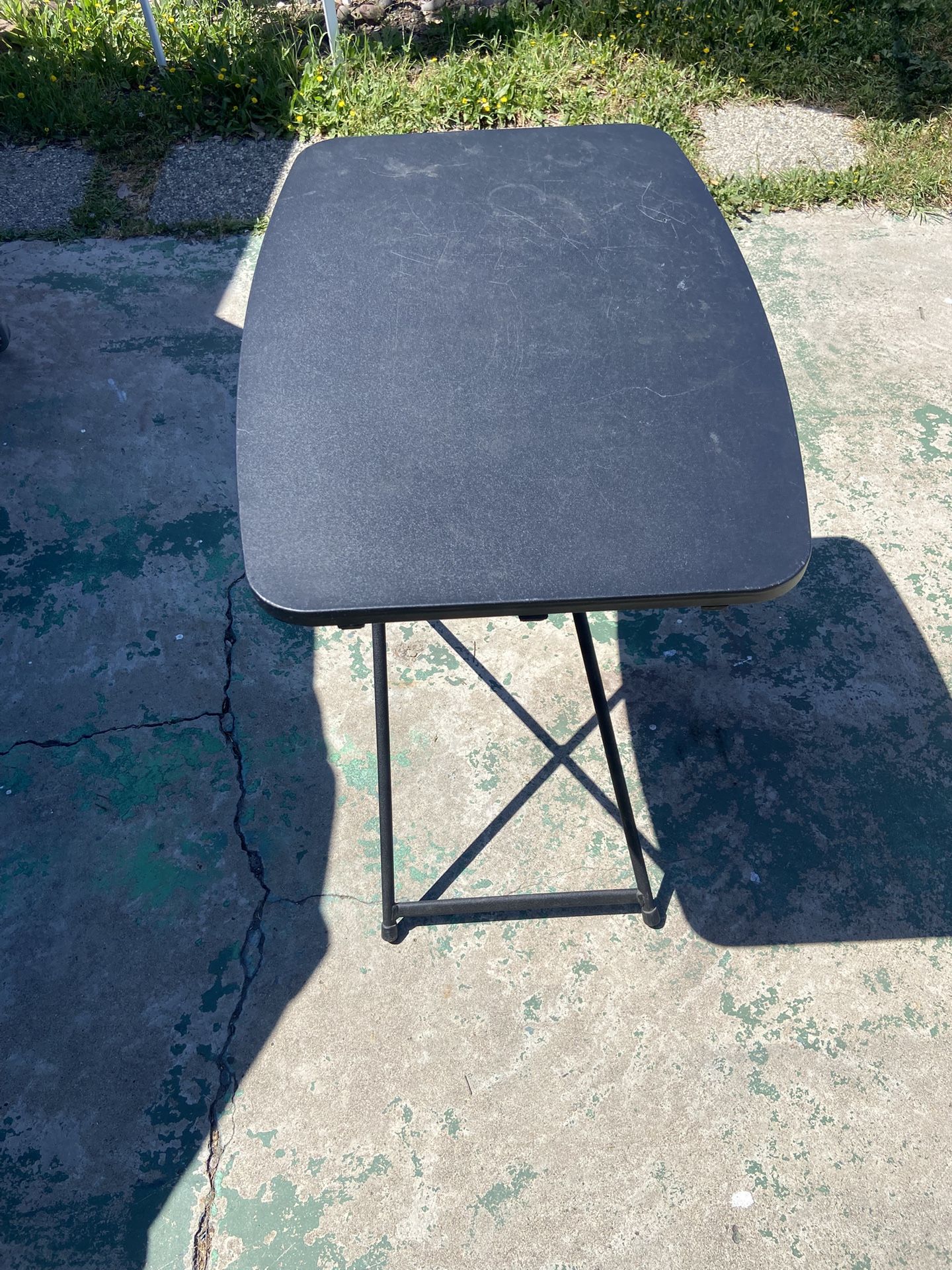 This is a Cosco personal folding table. The tabletop measures 18 inches deep by 26 inches wide. It features three height settings, ranging from 25 to 28 inches. It is designed to hold up to 30 lbs of evenly distributed weight.