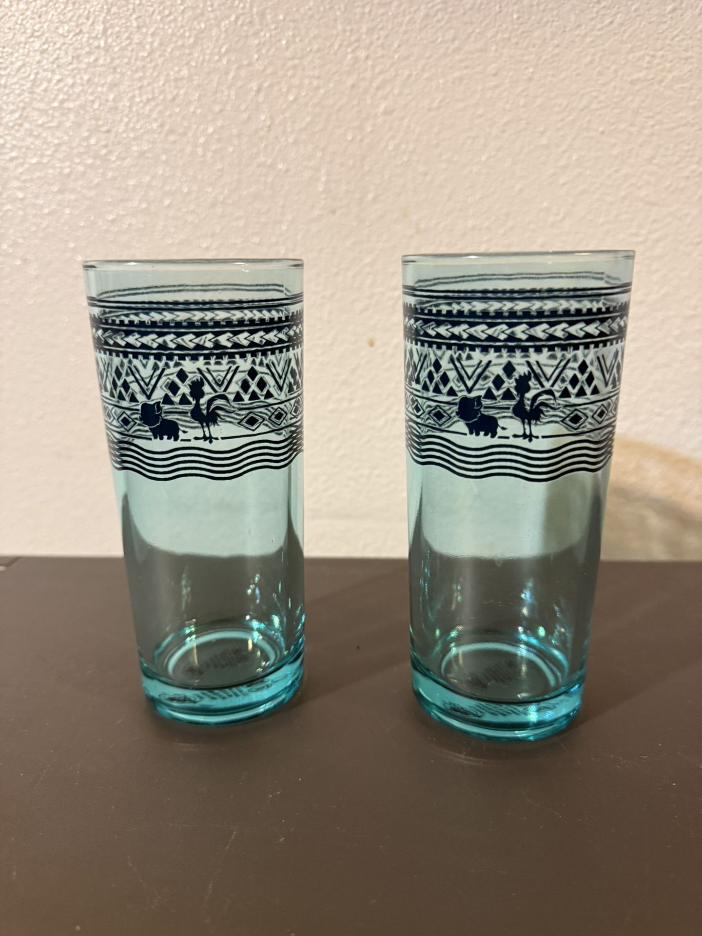 Pua and Hei Hei 10oz. Tall Glass Tumbler ( set of 2) There is a silhouetted in the geomtric design that circles the top of the tumbler. They are a collectable item featuring characters from the movie Moana