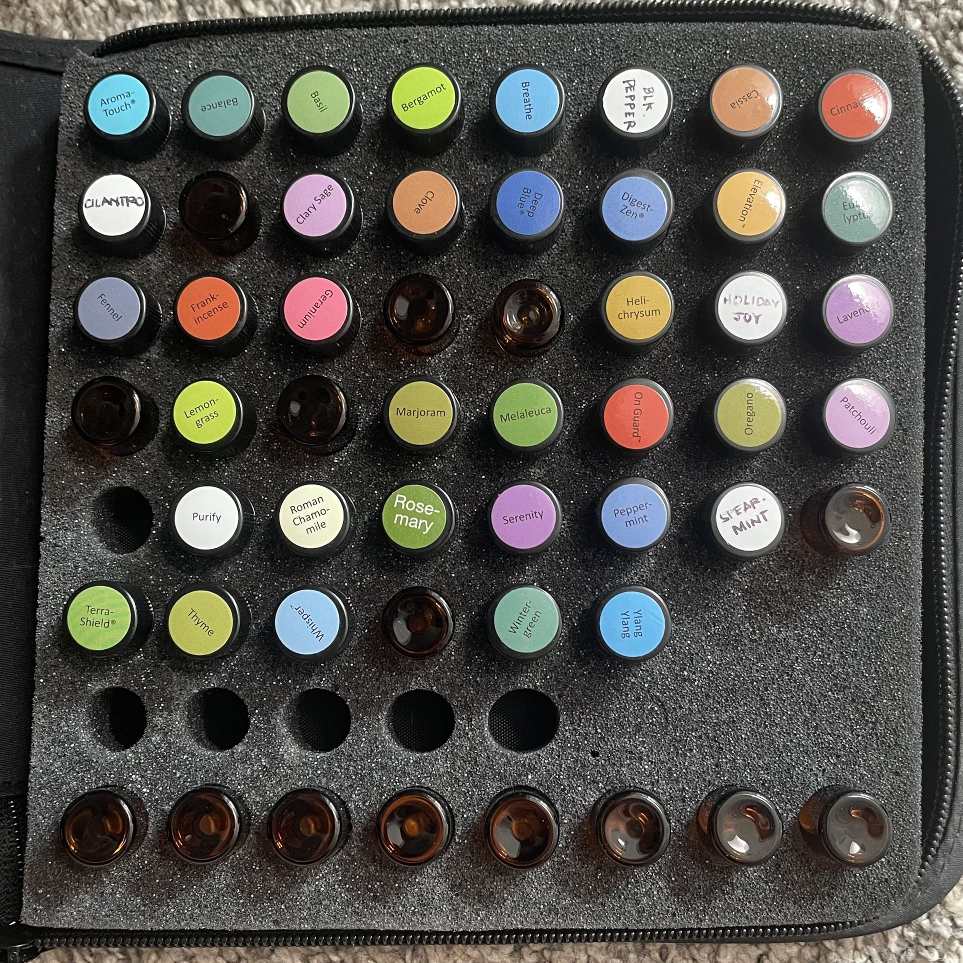 Small samples of doTERRA essential oils Sold as a set A few are empty, so I turned them over The row of bottles on the bottom has never been used
