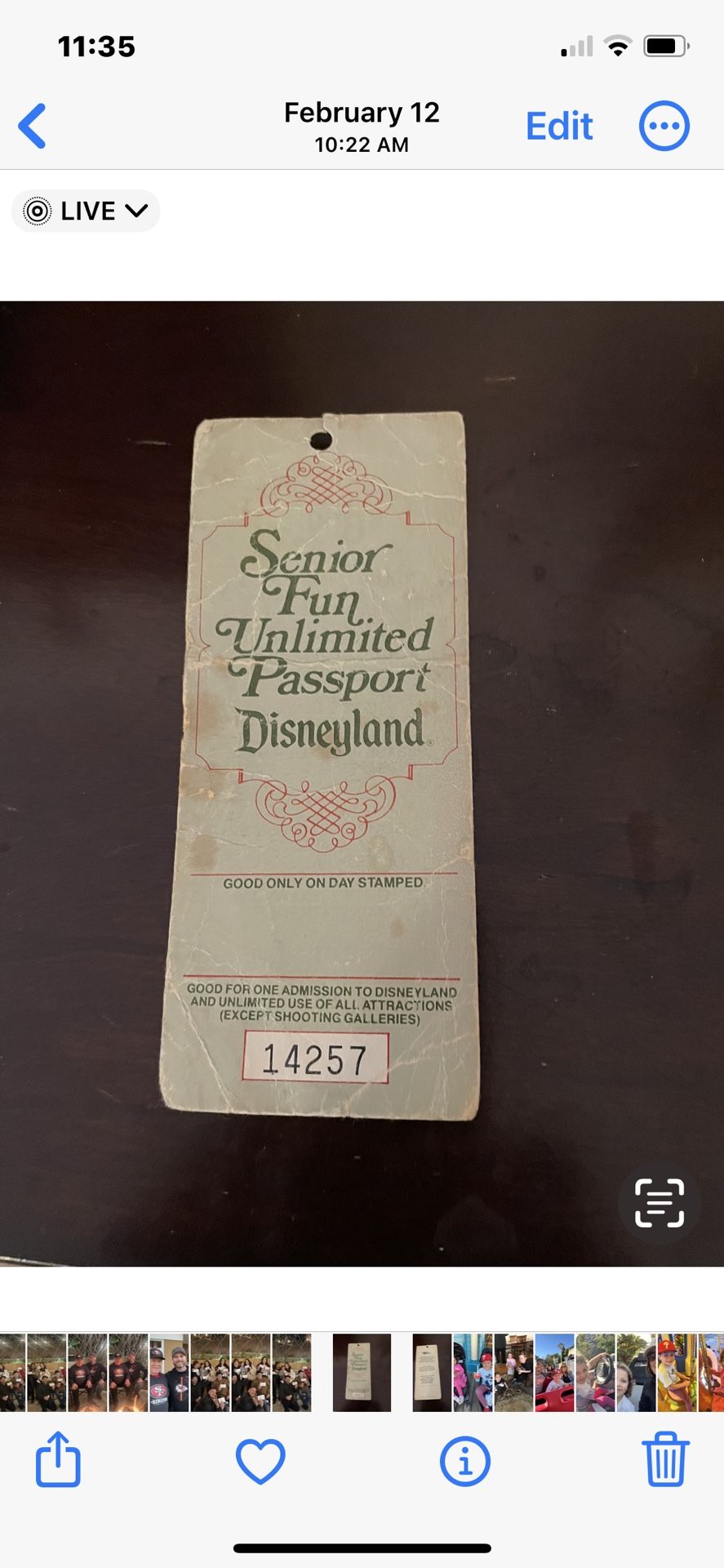 Disneyland Vintage Ticket. The ticket is Vintage and shows wear. You are able to get into Disneyland for one day with this ticket.