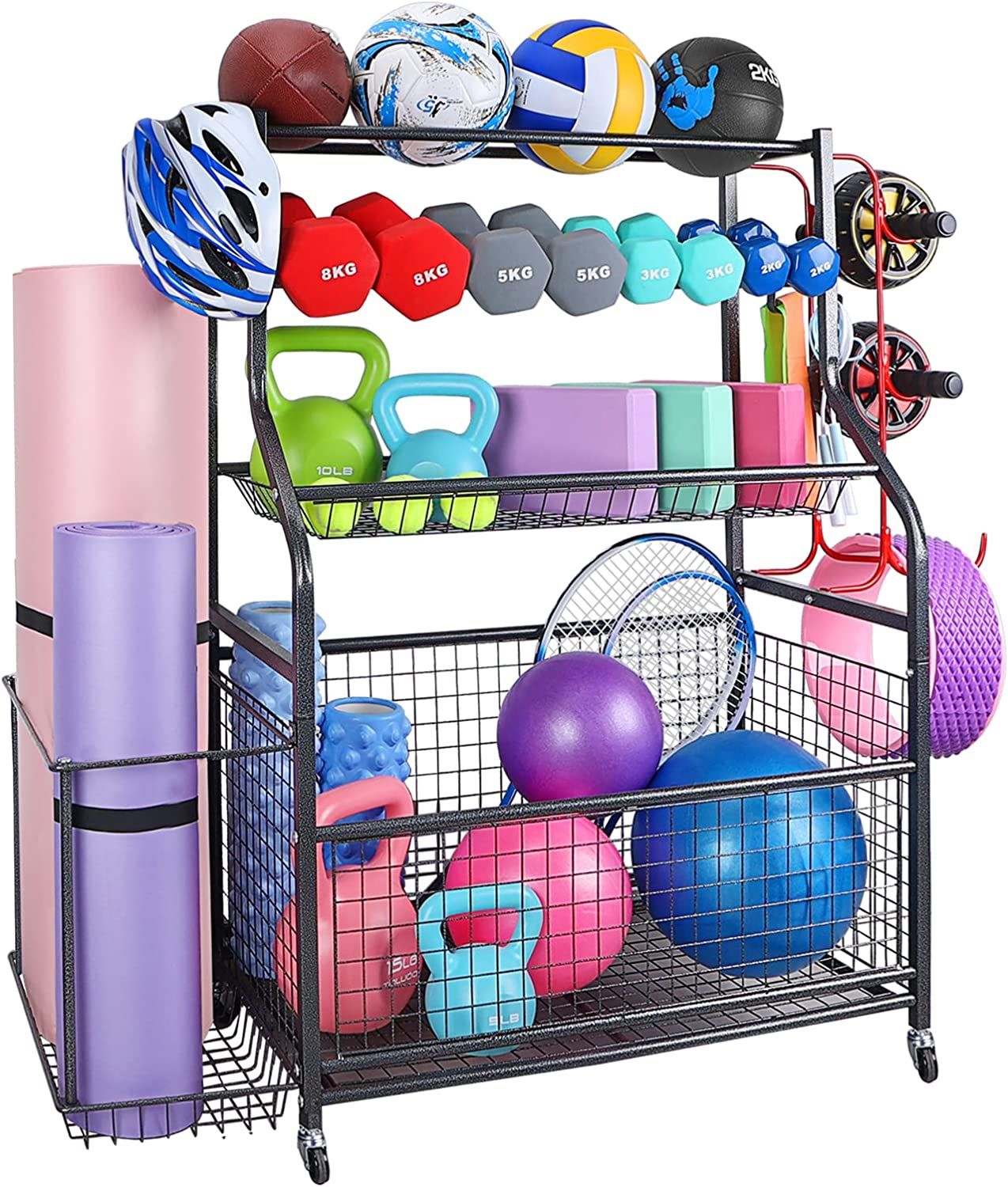 Dumbbell Rack, Weight Rack for Dumbbells, Home Gym Storage Organizer for Dumbbell, Kettlebells, Yoga Mat, All in One 4 Tier Weight Stand with Lockable Wheels and Hooks