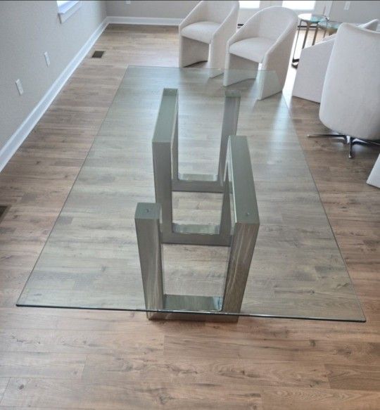 Plan was to put a live edge top but going in another direction. You can purchase stone, glass or wood from Home Emporium in Chesapeake. 52" long 30" high 20" wide Can be made into dining table, large desk or a conference table. Appears to be stainless. Solid construction. Adjustable feet for leveling. Rubber bumper here if you wish to put a glass on it. No glass, just base.